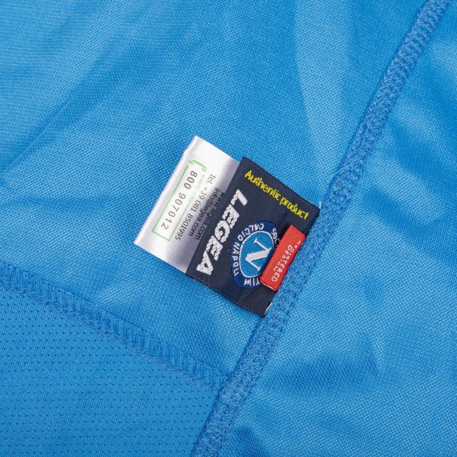 Modello Home manica corta azzurro. Il girocollo è in magliera bianco azzurro, frontalmente il lettering dello sponsor Legea applicato in flock, al centro del petto lo stemma del Napoli finemente ricamato, sotto applicato in flock lo sponsor commerciale Russo Cicciano. Su entrambe le maniche ricamato in bianco il logo Legea, mentre sulla destra cucita la patch Serie B. Sul retro la personalizzazione Zanini 20 applicata in gommina.