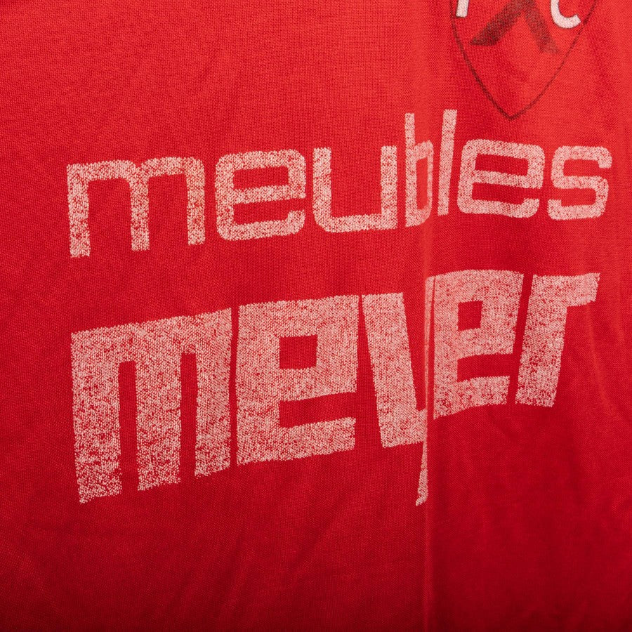 Modello a maniche lunghe, rossa con inserti bianchi. Lato cuore stemma squadra in serigrafia, sulla destra logo Adidas. Al centro Sponsor Commerciale Meubles Meyer.