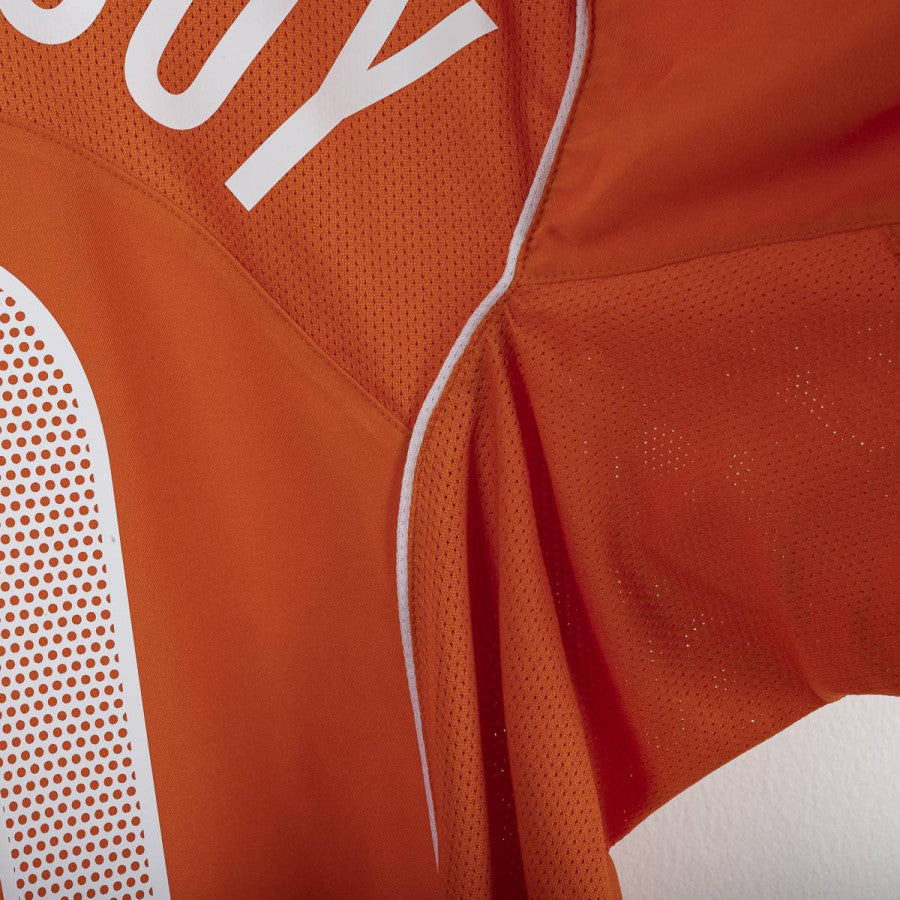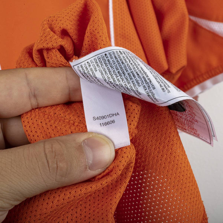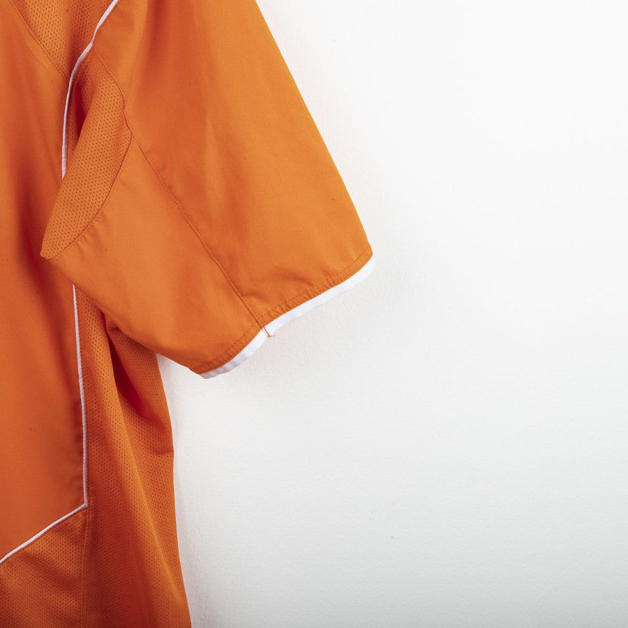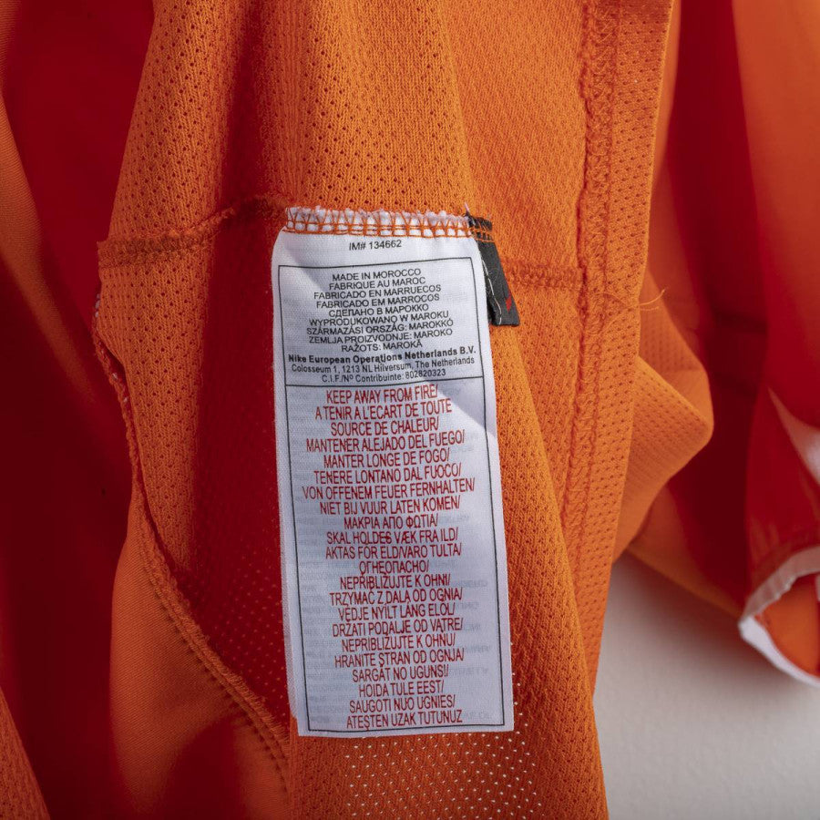 Maglia home della nazionale olandese indossata a Euro 2004, prodotta da Nike. Design arancione classico con dettagli bianchi. Stemma KNVB ricamato al centro sotto il colletto, logo Nike ricamato sul petto destro. Numero 10 stampato sul fronte all'interno di un cerchio, nome V. Nistelrooy e numero 10 applicati sul retro in bianco traforato. Modello Total 90 con colletto a V. Vestibilità regolare. Taglia XL.