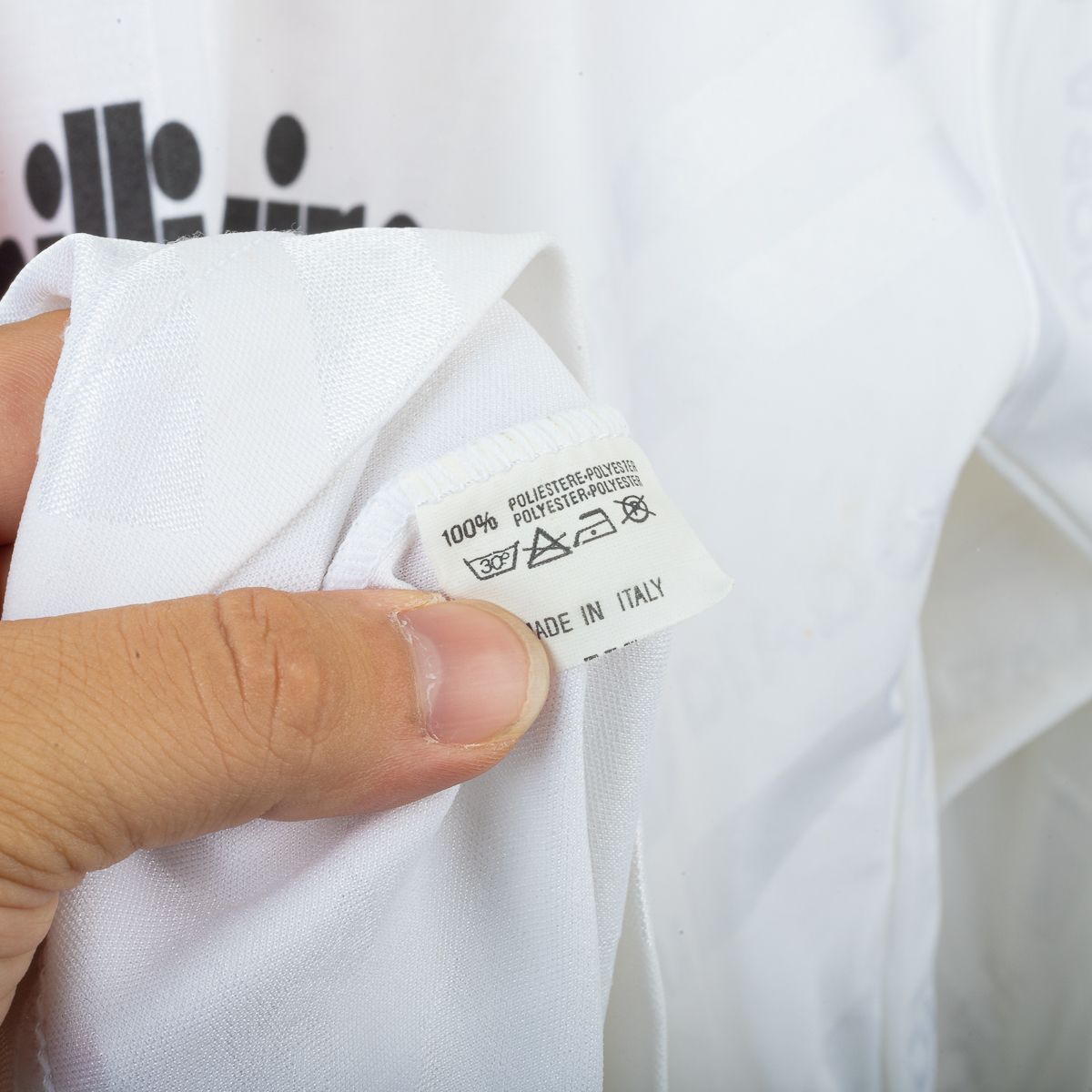 Maglia home ufficiale del Calcio Padova stagione 1996/1997, prodotta da Diadora. Divisa bianca a maniche lunghe con dettagli rossi, sponsor Millionaire Market e logo Diadora sulla spalla. Patch Lega Calcio Lega Calcio 1946-1996 sulla manica e stemma del cavallino sul petto. Nome e numero Bergodi 6 sul retro. La Maglia appartiene alla collezione personale di un ex fotografo di campo. Il COA sarà inviato con l'acquisto della maglia.