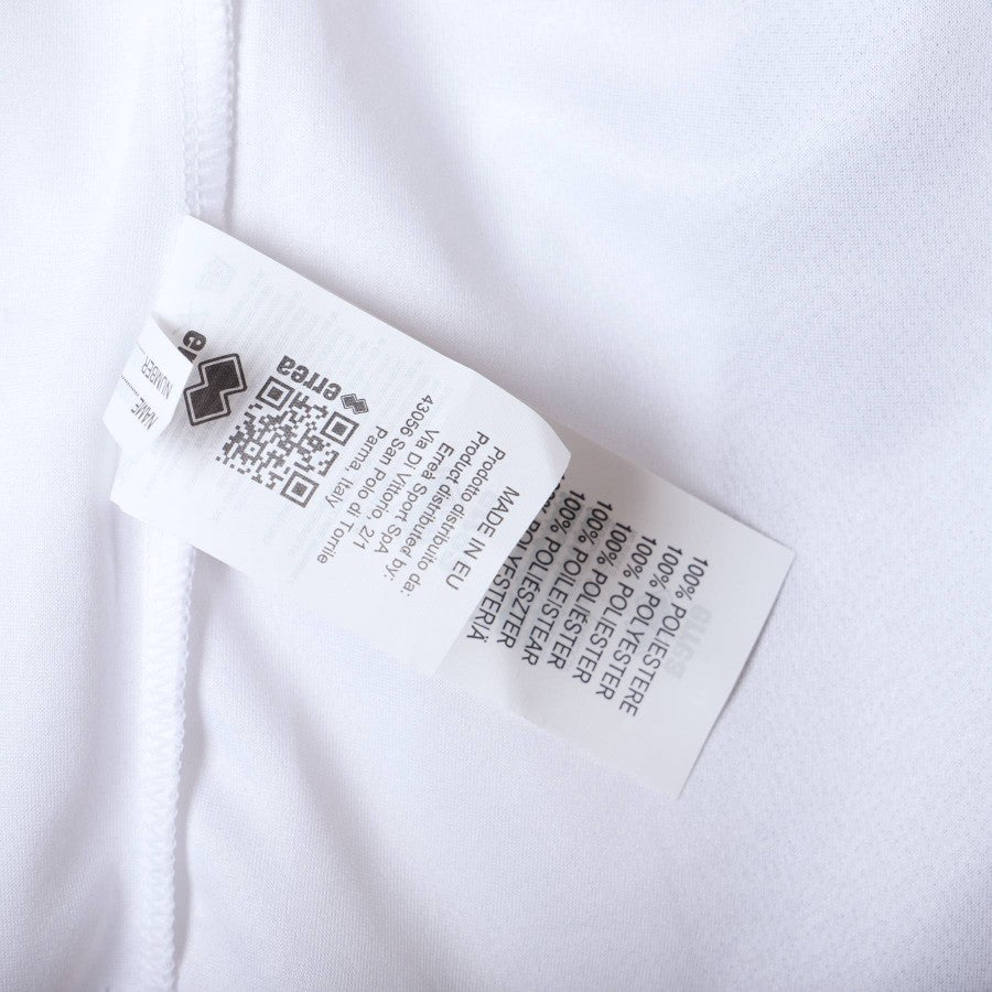 Modello a manica corta e girocollo con spacchetto. Colori bianco e nero. Patch del Parma cucito lato cuore e logo dello sponsor tecnico Errea ricamato in oro al centro.