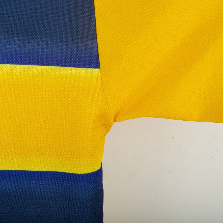Maglia home del Parma prodotta da Champion per la stagione 2000/2001, personalizzata con il nome Thuram e il numero 21. Modello a manica corta di colore giallo con bande orizzontali blu. Logo Champion applicato sulle maniche e sul petto, sponsor commerciale “Mr. Day” stampato al centro. Stemma Parma A.C. cucito lato cuore. Sul retro presente la personalizzazione “THURAM” e numero 21 in blu. Vestibilità regolare. Taglia XL.