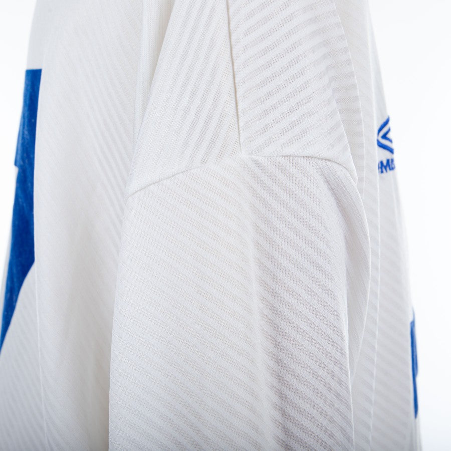 Il prodotto si può ben osservare dalle diverse foto. La maglia è a maniche lunghe, ha un colletto rialzato con leggero scollo a V e il suo colore predominante è il bianco, anche se i polsini e il colletto prevedono il blu con bordi gialli; in alto a sinistra è applicato il logo del club, mentre dalla parte opposta si trova il logo di Umbro, in colore blu, con tanto di dicitura; sotto, è applicato lo sponsor commerciale, "parmalat", sempre in colore blu e in vellutino.