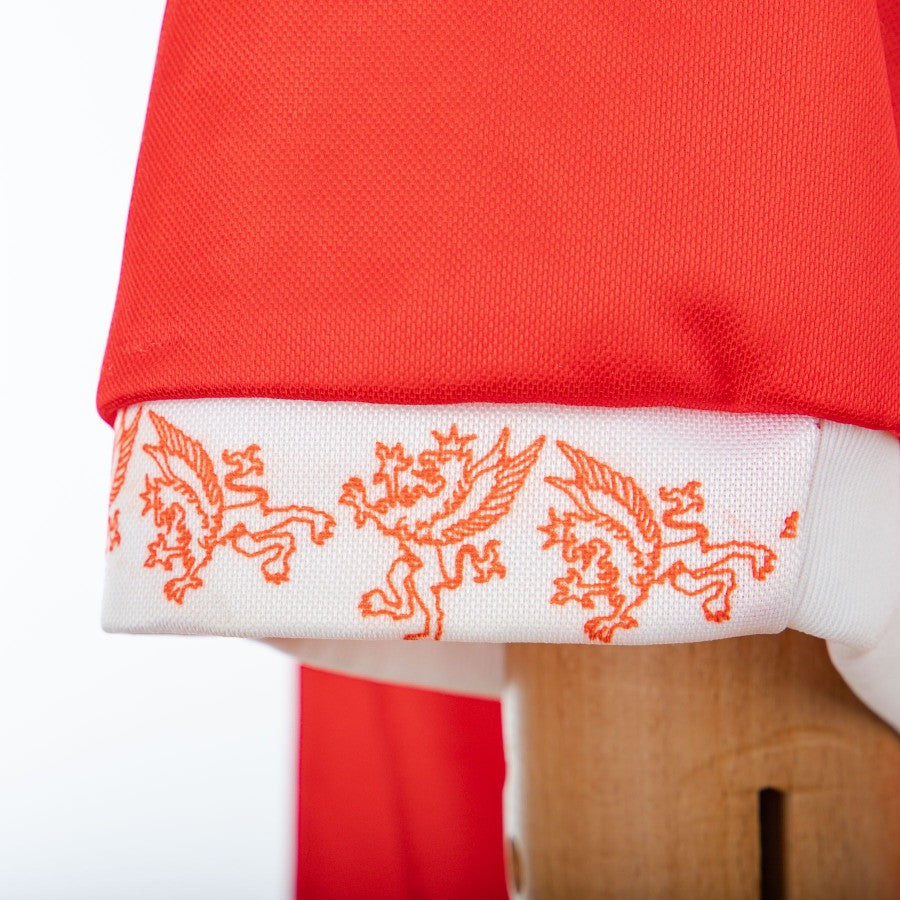 Il prodotto si può ben osservare dalle varie foto. La maglia è a maniche corte, ha un colletto rialzato bianco che che si chiude tramite un bottone e il suo colore predominante è il rosso, anche se il bianco prima citato è presente anche sui bordi delle maniche; in alto, leggermente defilato verso destra, è applicato il logo di 2T Sport, con una combinazione di colori bianco e rosso; scendendo, ecco in sublimatico un grande grifone bianco, creatura simbolo del Perugia; più in basso ancora, sempre in sublimatico, è applicata la dicitura CASSA RISPARMIO PERUGIA, in colore bianco.