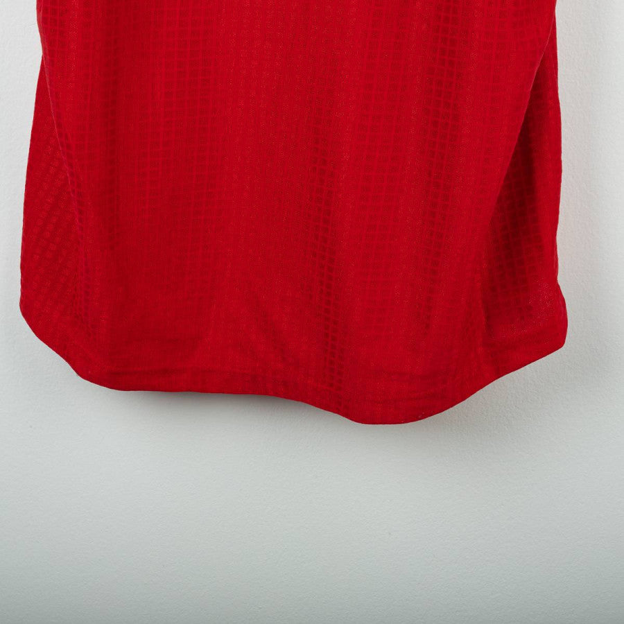 Maglia home del Perugia stagione 2001/2002 prodotta da Galex. Classico colore rosso con inserti bianchi e dettagli in grigio. Colletto rotondo elasticizzato a coste bianche e rosse. Logo Galex in vellutino bianco applicato sul petto destro e stemma A.C. Perugia stampato in flock sul lato cuore. Sponsor centrale “Daewoo Matiz” in vellutino bianco. Patch Lega Calcio. Nome e numero “Tedesco 4” stampati sul retro in flock bianco con bordo grigio, tipologia ufficiale Galex. Motivo jacquard a griglia sul tessuto tecnico traspirante. Vestibilità regolare, taglia L, Made in Italy. La Maglia appartiene alla collezione personale di un ex fotografo ed era in un quadro. Il COA sarà inviato con l'acquisto della maglia.
