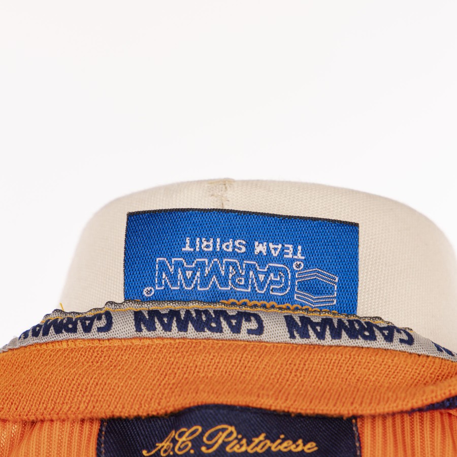 maglia home pistoiese a maniche corte, in ottime condizioni e con colori ancora sgargianti e decisi. assenza di difetti o lacerazioni. Prodotto realizzato grazie allo sponsor tecnico Garman e dallo sponsor commerciale Vannucci piante per la stagione 2001/2002 e personalizzata sul retro col numero 13 Carbone. Taglia XXL.