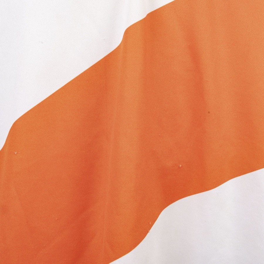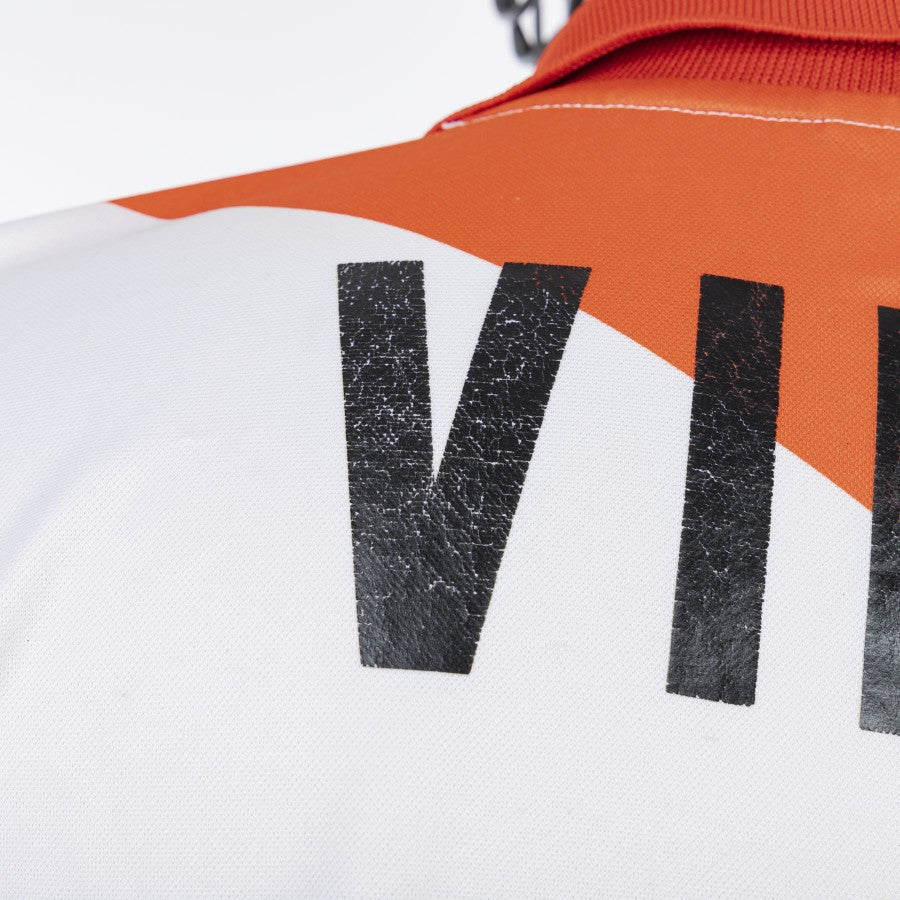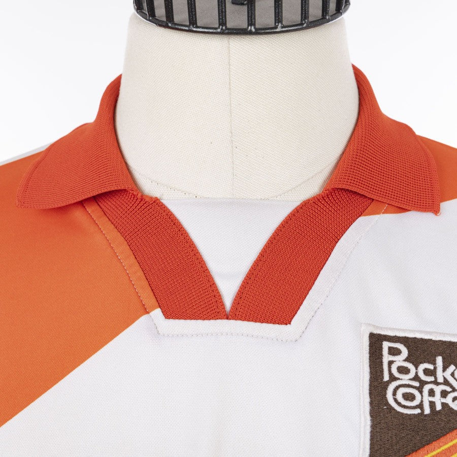 Il modello della Poket Cofee è con strisce trasversali in bianco ed arancione, mentre le maniche si presentano in terra bruciata. I bordi delle maniche, così come il colletto e lo scollo a V, sono in maglina ed arancioni. Sul davanti del modello, lato cuore, è cucito lo stemma della Pocket coffee football stars, mentre sul retro insiste la personalizzazione col numero 32 Vieri.