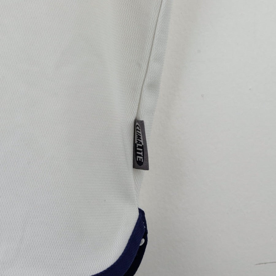 Maglia Home Real Madrid Adidas Raul 7 2000/2001. Classica divisa casalinga del Real Madrid con design pulito ed elegante: il bianco domina la scena, accompagnato da dettagli blu navy su colletto, maniche e inserti laterali. Lo stemma del club è posizionato sul cuore, mentre il logo dello sponsor tecnico Adidas si trova a destra. Sul retro, la personalizzazione Raul 7 richiama uno dei giocatori simbolo della storia del club. Sulla manica è presente la patch ufficiale della Liga spagnola. Taglia M.