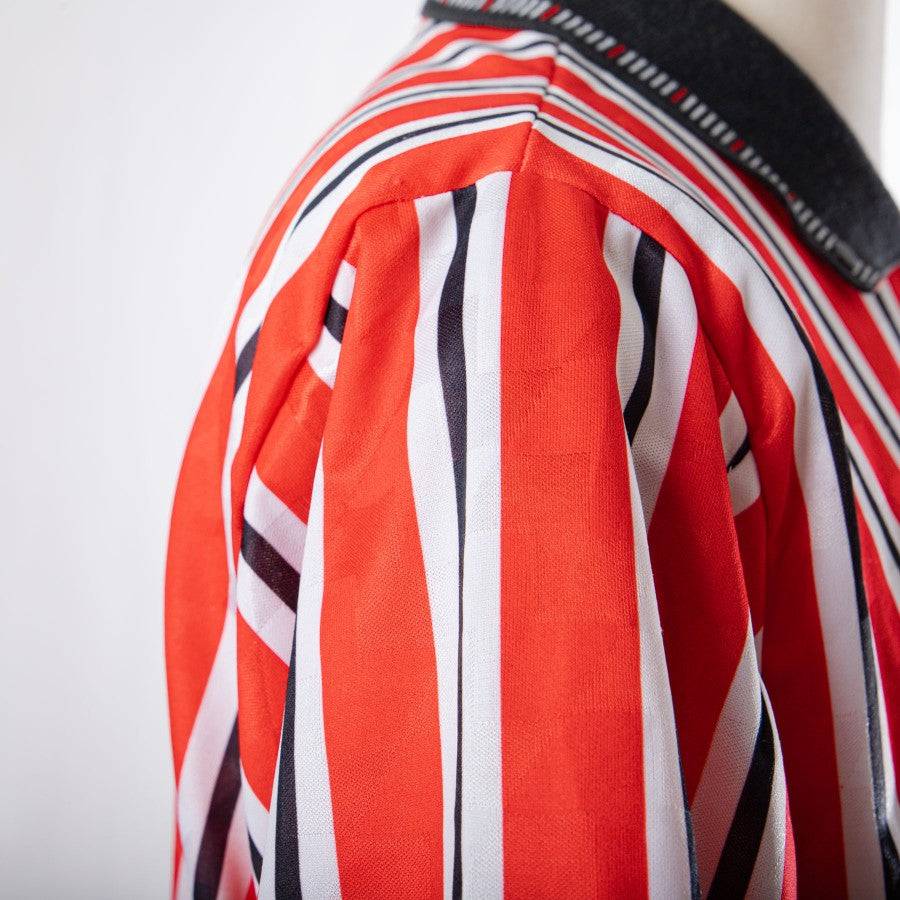 Maglia in versione home dello Sheffiled United prodotta da Umbro per la stagione 1990/1991. Fantasia a righe verticali rosse, bianche e nere, manica corta e colletto a polo con bottoncini a pressione. Loghi della squadra e dello sponsor Umbro applicati sulla parte frontale.
