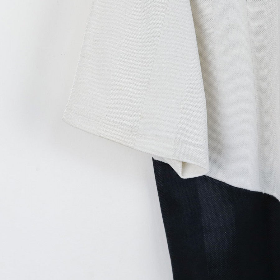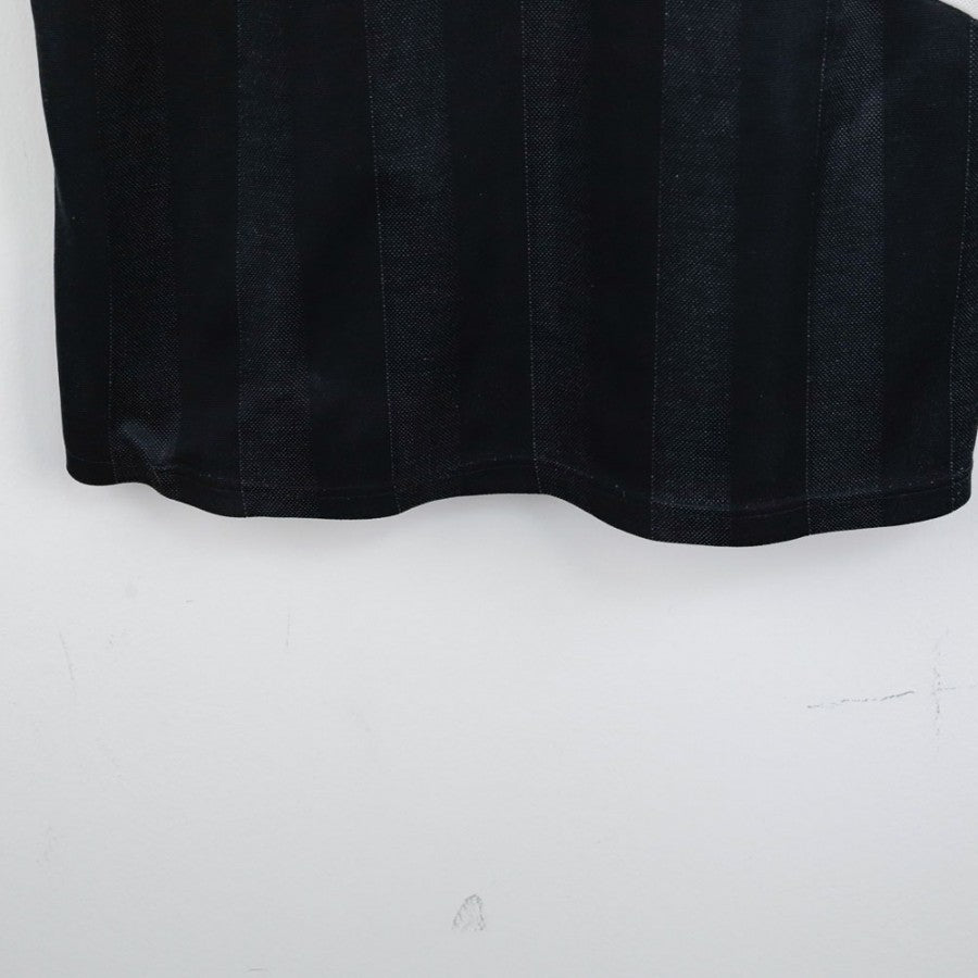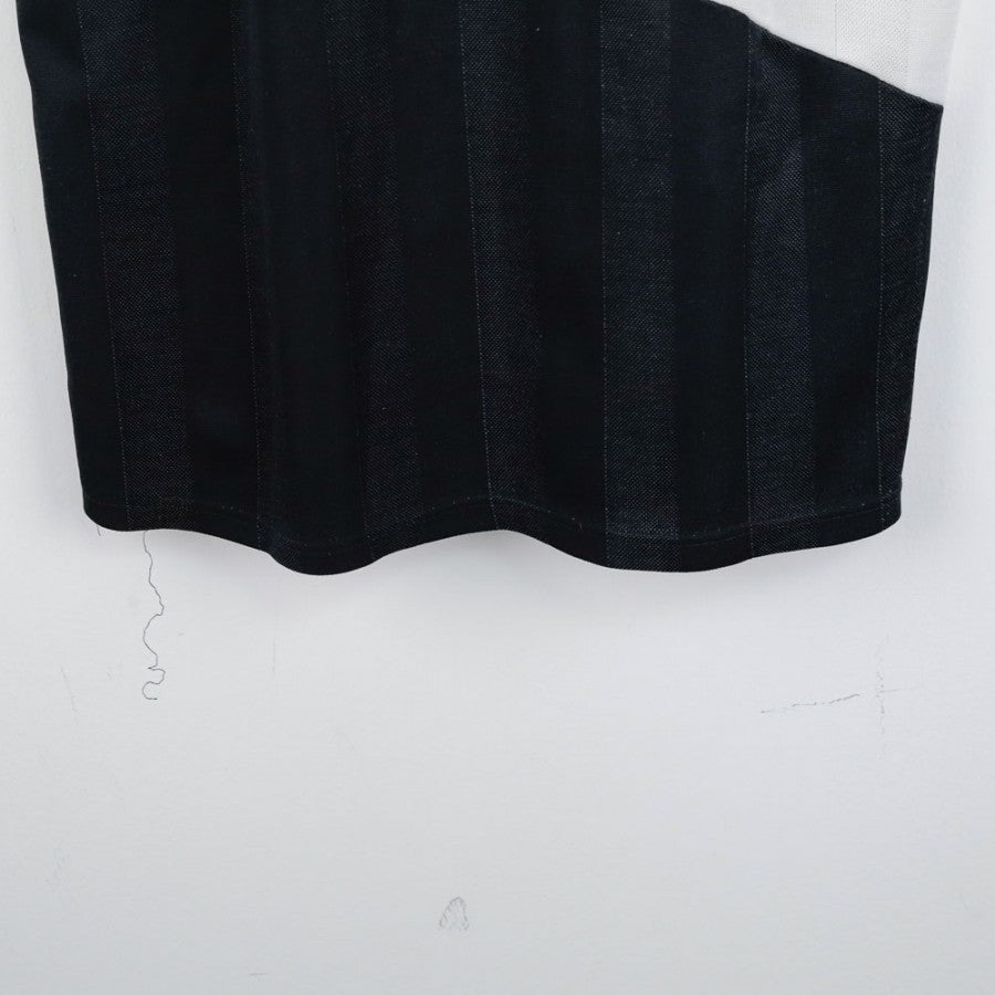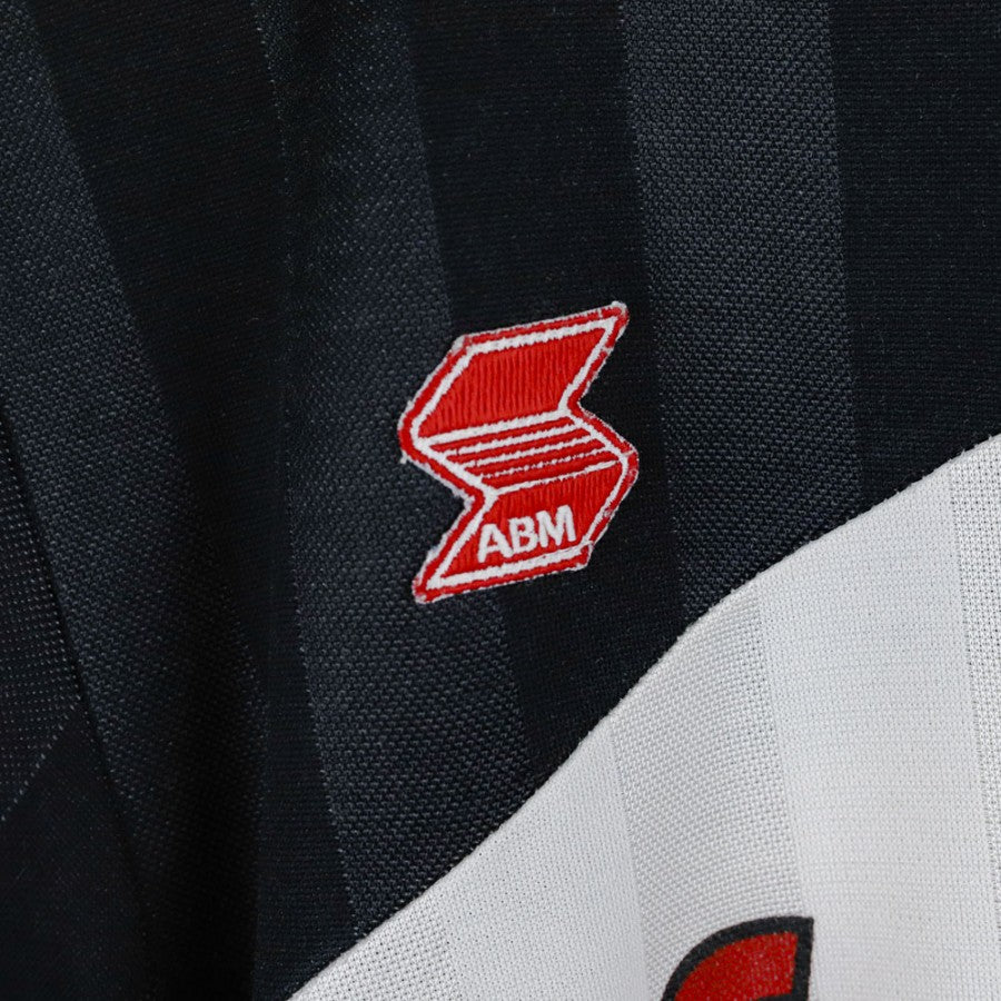 Questa è la maglia home ufficiale dell'Udinese, stagione 1986/1987, prodotta dallo sponsor tecnico ABM. Il design è iconico, caratterizzato dalla banda diagonale bianca su fondo nero a righe verticali sottili. Sul petto troviamo lo stemma dell'Udinese, a destra, e il logo rosso dello sponsor commerciale "Freud", posizionato al centro. Il colletto è bianco con una forma classica a V. Sul retro della maglia è presente il numero 15 in rosso, con un font tridimensionale tipico dell'epoca.