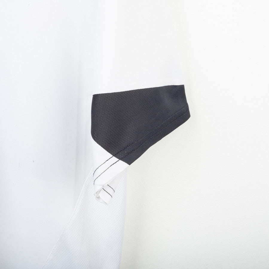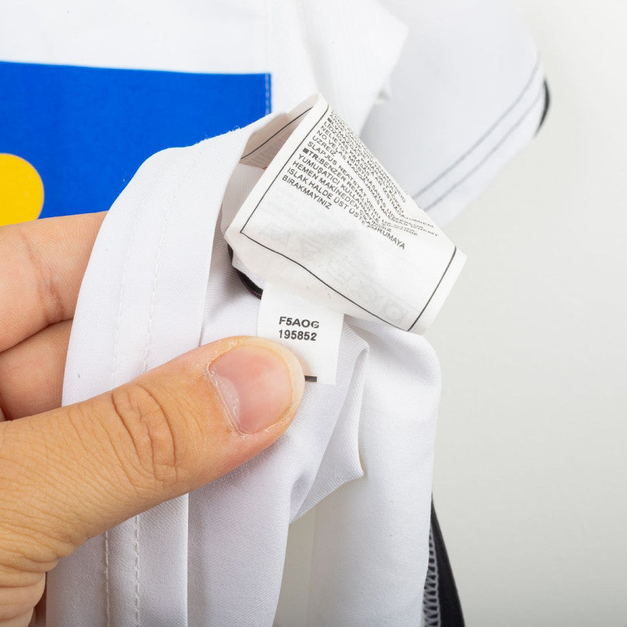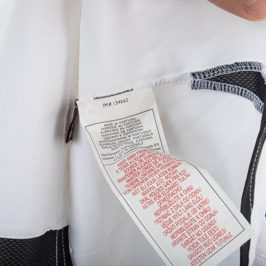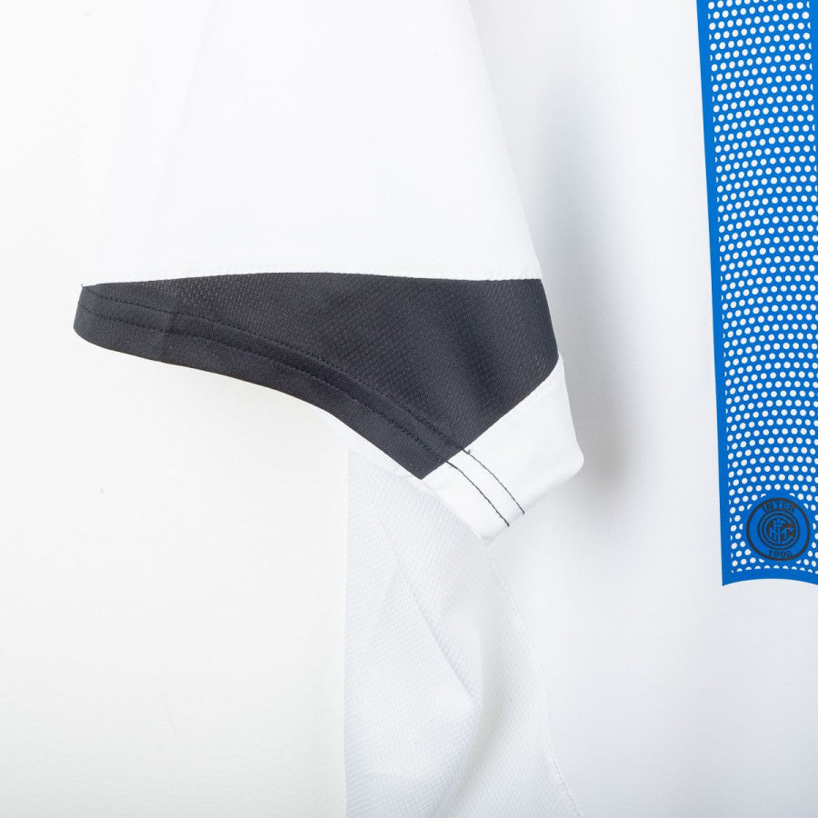 Maglia away dell'Inter stagione 2005/2006 prodotta da Nike, indossata nella stagione del titolo assegnato post Calciopoli. Design bianco con banda orizzontale centrale nera e blu con sponsor Pirelli in giallo. Logo Nike ricamato sul petto destro, stemma Inter floccato. Nome e numero “Adriano 10” stampati sul retro in blu. Colletto e bordi maniche grigio antracite, tessuto tecnico leggero traspirante.