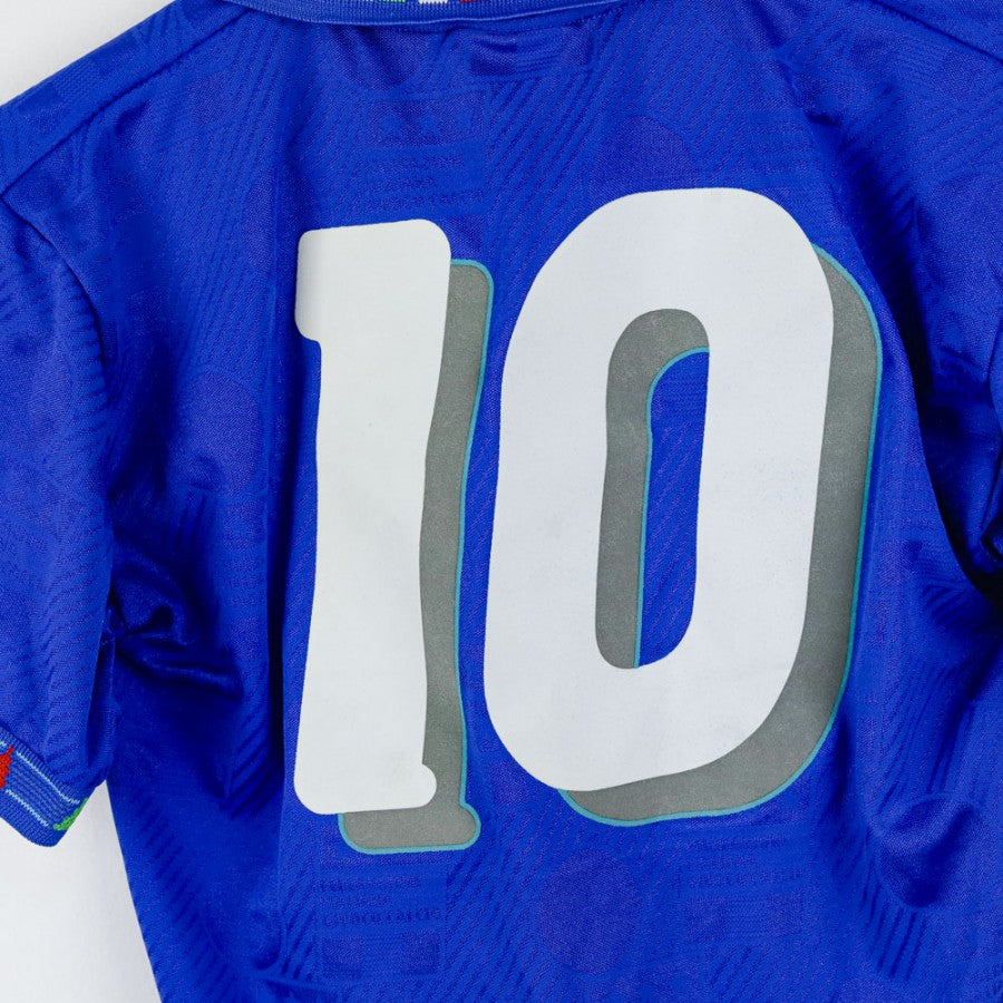 Maglia ufficiale da bambino della Nazionale Italiana per i Mondiali di USA 1994, prodotta dallo sponsor tecnico Diadora. Questa maglia, nella classica tonalità azzurra, è caratterizzata dal numero 10 sul retro, reso celebre da Roberto Baggio, uno dei protagonisti più amati di quel torneo. Il colletto e le maniche presentano dettagli con tricolore e piccoli triangoli, simbolo distintivo del design Diadora di quell'epoca. Sul petto, lo stemma della FIGC (Federazione Italiana Giuoco Calcio) con le tre stelle simboleggia i titoli mondiali vinti dall'Italia.