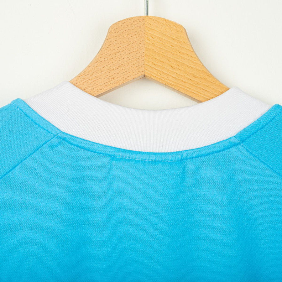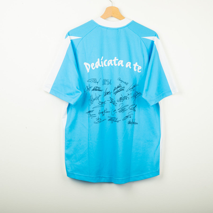 Maglia celebrativa ufficiale della S.S. Lazio stagione 2003/2004, prodotta da Puma. Modello azzurro con dettagli bianchi e stemma del club ricamato sul petto. Sul retro la scritta “Dedicata a te” e le firme stampate dei giocatori biancocelesti. Tessuto tecnico leggero e traspirante, ideale per collezionisti e tifosi. Un omaggio speciale alla squadra e ai suoi sostenitori. Taglia M.