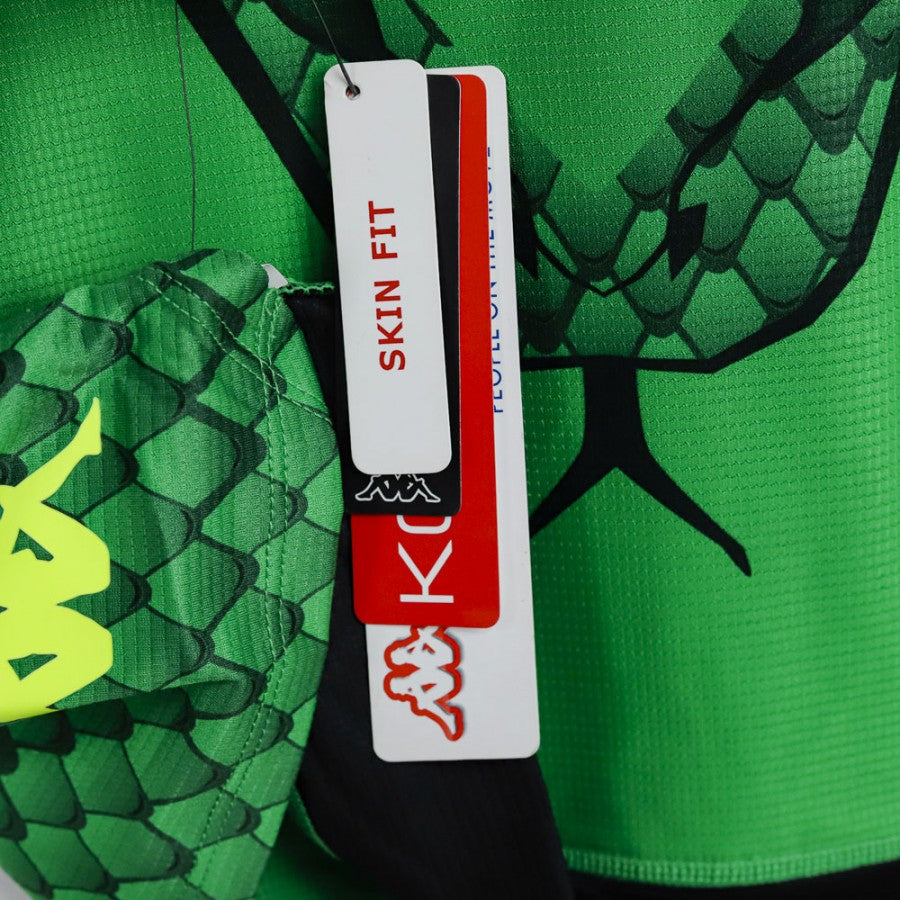 La maglia da portiere ufficiale del Napoli per la stagione 2018/2019, prodotta dallo sponsor tecnico Kappa, si distingue per il suo originale design ispirato alla pelle di drago, con tonalità verde acceso. Lo stemma del club è cucito lato cuore, mentre gli sponsor commerciali Lete e Garofalo sono ben visibili sul petto. La personalizzazione sul retro riporta il nome Meret e il numero 1, celebrando il giovane portiere che si è distinto per le sue prestazioni nella stagione. Sulle maniche è presente il patch ufficiale della Champions League, simbolo delle sfide internazionali della squadra. Questa maglia è in taglia XXXL, perfetta per i tifosi e i collezionisti più esigenti.