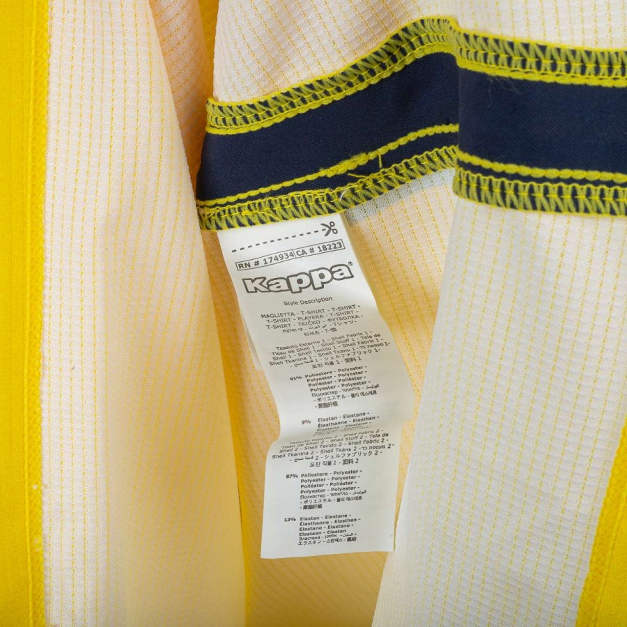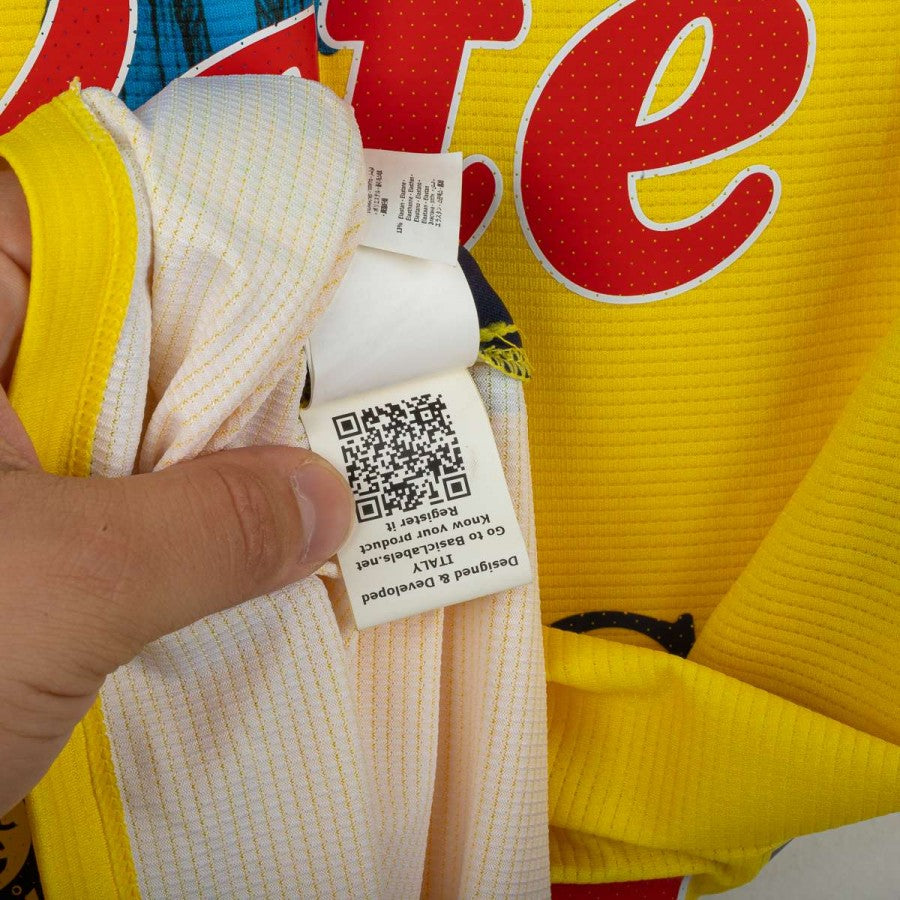 Maglia da portiere del Napoli utilizzata nella stagione 2020/2021, in edizione limitata Marcelo Burlon. Prodotta da Kappa, è la versione gara ufficiale, taglia XL. Colore giallo con grafica iconica a piume blu sulle spalle. Patch Serie A 2020/21 applicata su entrambe le maniche, sponsor Lete, MSC e Kimbo. Stemma SSC Napoli termosaldato, nome Ospina e numero 25 sul retro. Edizione limitata numerata 140/200, come da etichetta sul fondo. Vestibilità aderente.