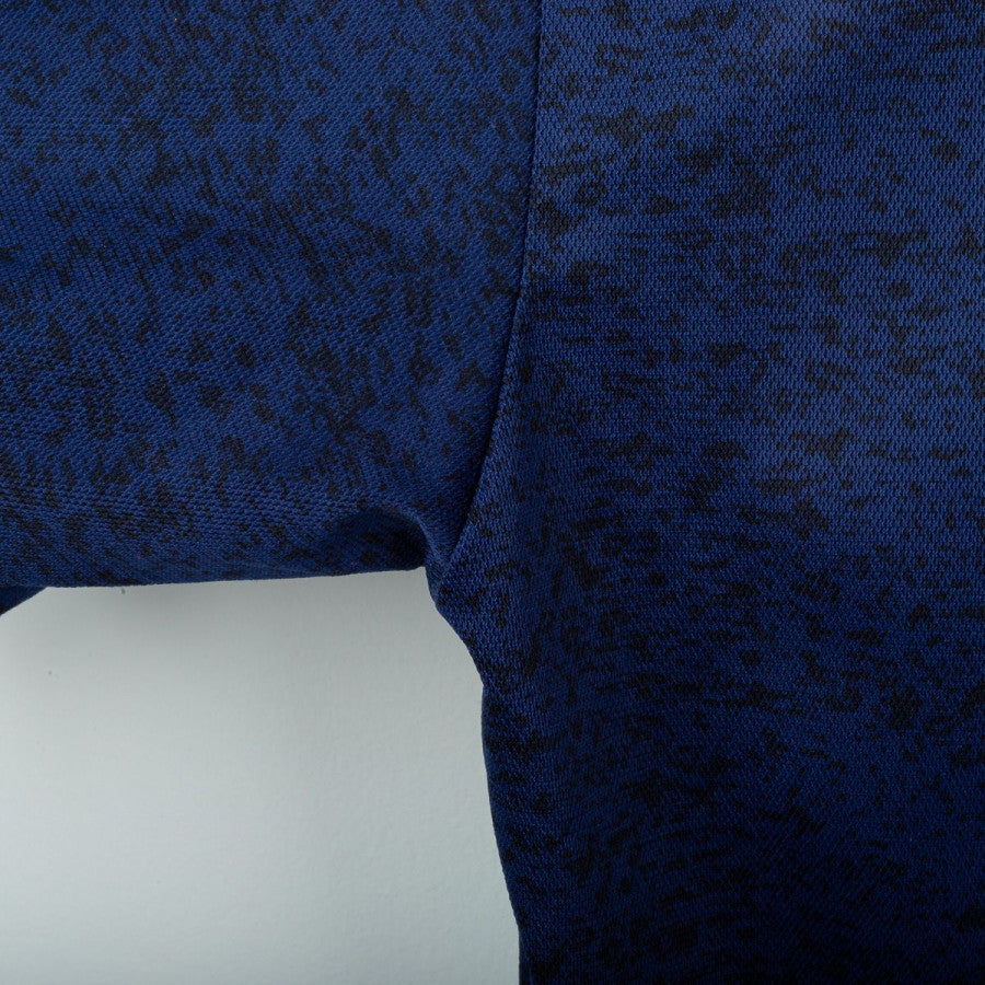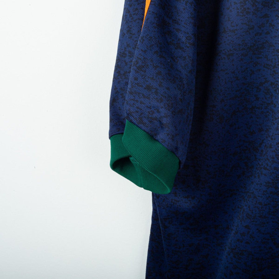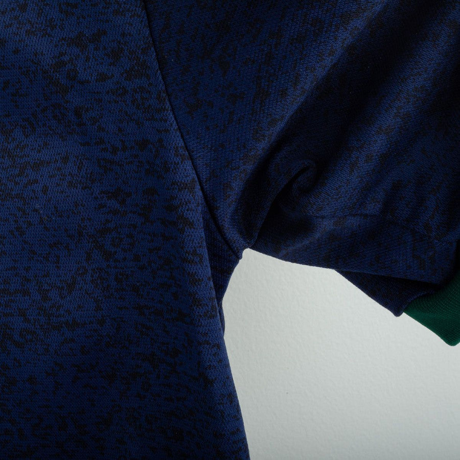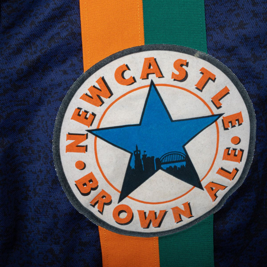 Maglia away del Newcastle United utilizzata nella stagione 1997/1998, prodotta da Adidas. Colore blu navy con pattern a effetto marmorizzato e fascia verticale verde e arancione sul lato sinistro. Logo Adidas cucito sul petto destro, stemma del club cucito lato cuore e sponsor Newcastle Brown Ale applicato in stampa gommata. Nome Shearer e numero 9 sul retro in flock bianco. Colletto e bordo manica a coste verdi con dettagli arancioni. Tessuto in poliestere Climalite tipico Adidas anni '90, traspirante e resistente. Vestibilità regolare. Taglia L.