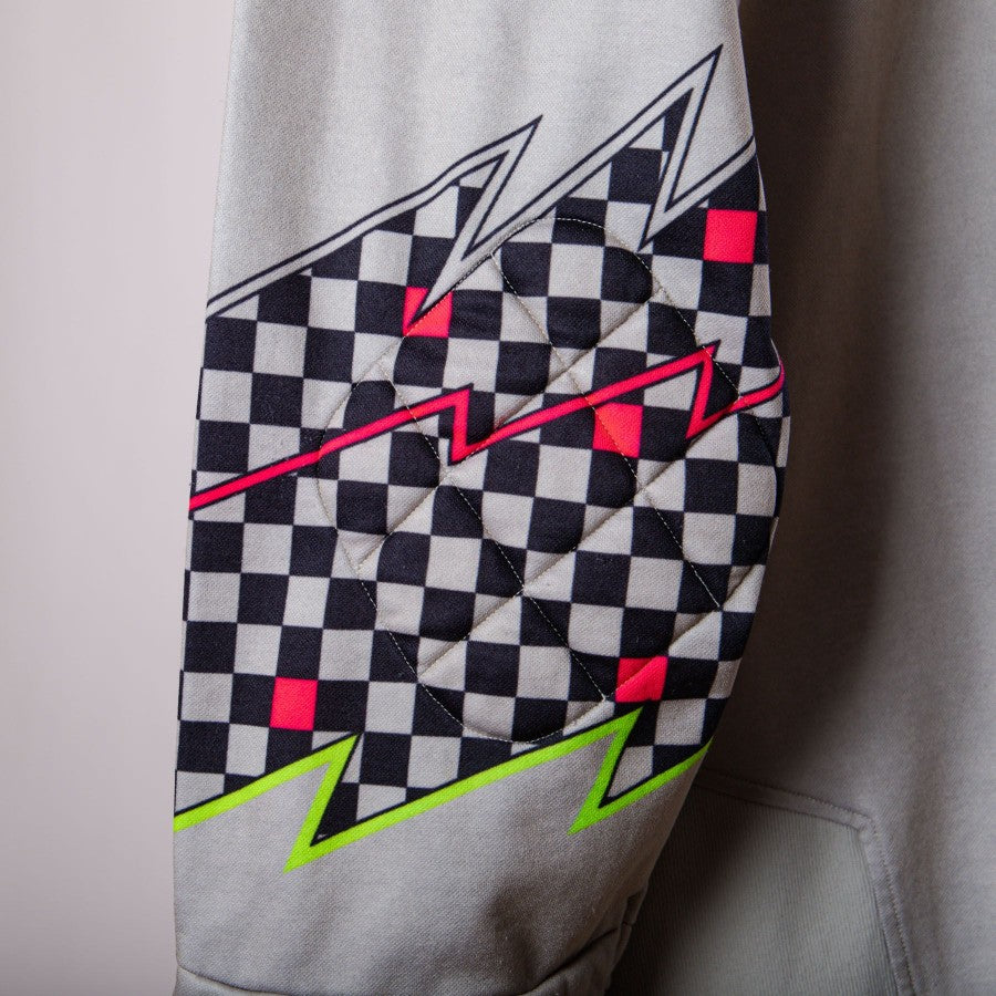 Modello a manica lunga prevalentemente di colore grigio, ma con vivaci dettagli giallo e rosa fluo.