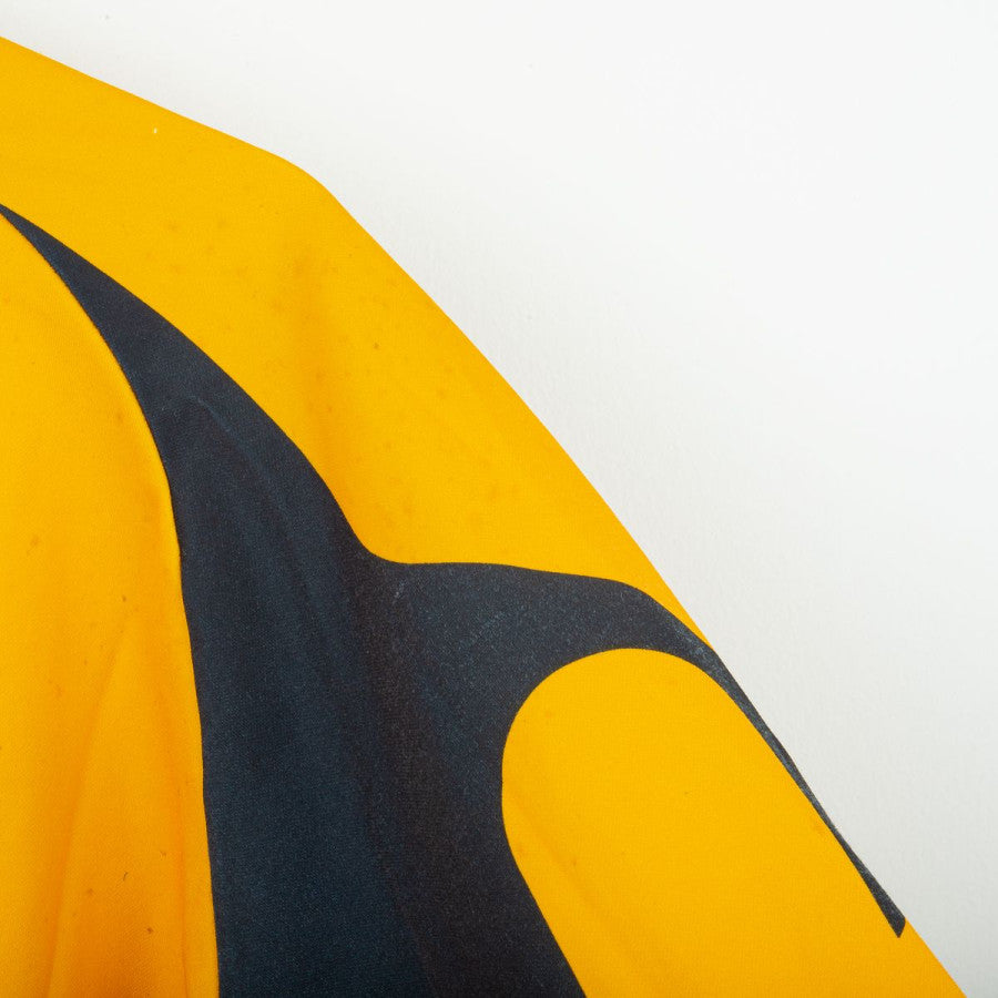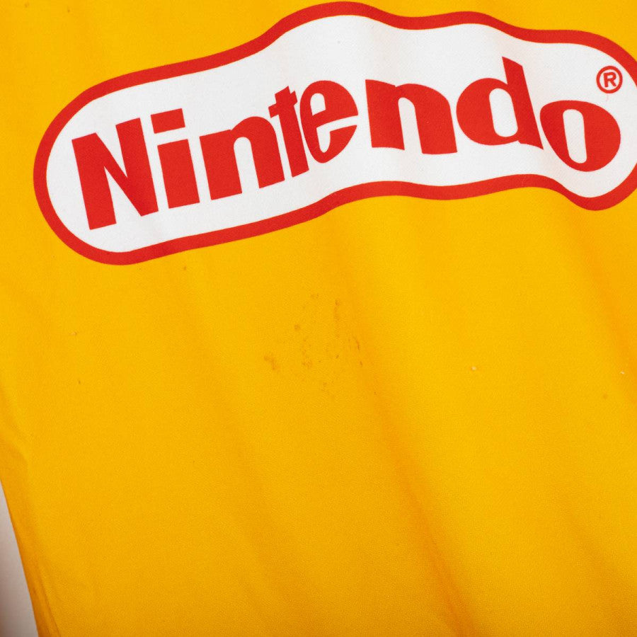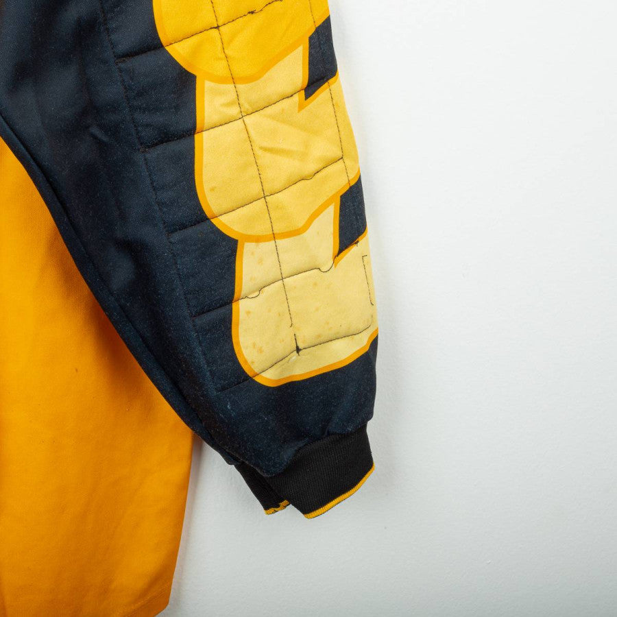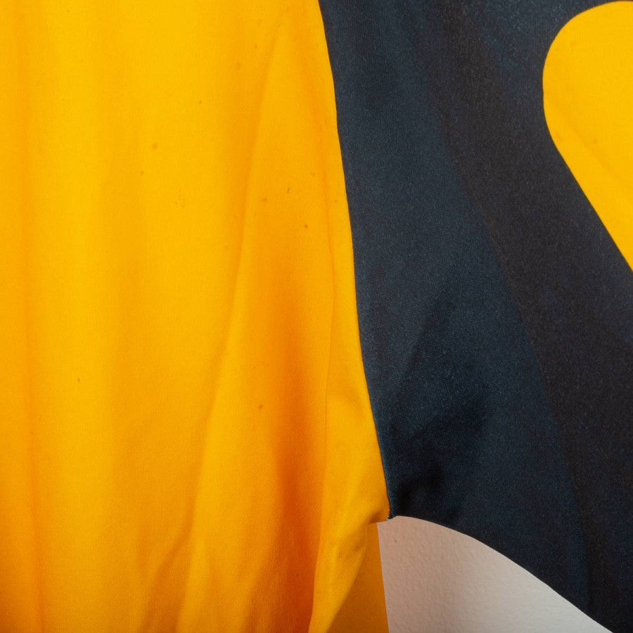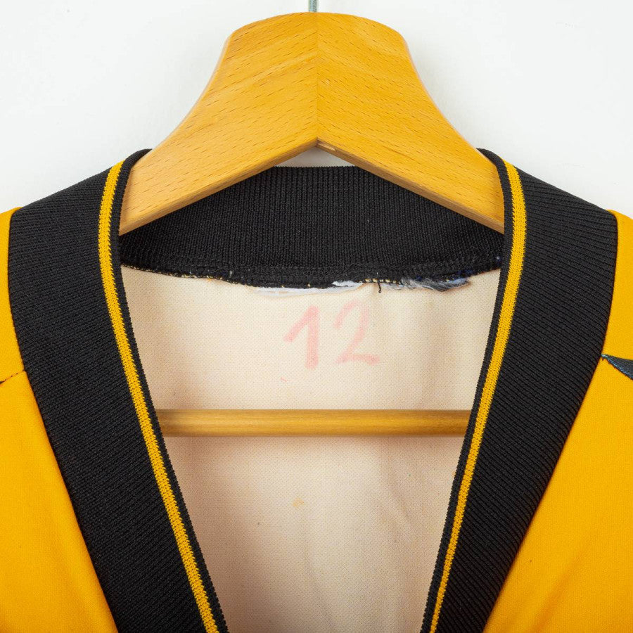 Maglia portiere della Fiorentina stagione 1997/1998 prodotta da Fila. Design iconico con base gialla e inserti neri a contrasto sulle maniche, caratterizzate da rinforzi imbottiti. Colletto a V nero con bordo giallo. Logo Fila ricamato sul petto destro e stemma ACF Fiorentina cucito lato cuore. Sponsor centrali “GiG” e “Nintendo” stampati. Realizzata in tessuto tecnico traspirante, con vestibilità ampia tipica dei portieri anni '90. Numero interno “12” scritto a mano sotto il colletto, indizio di maglia da gara o da dotazione squadra. Taglia non indicata (circa XL).