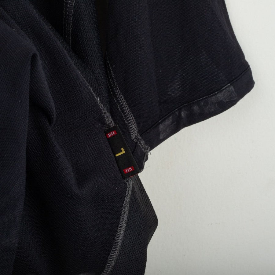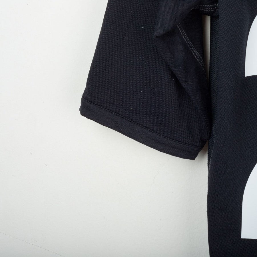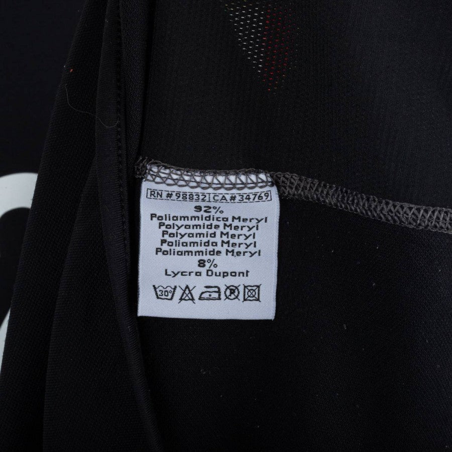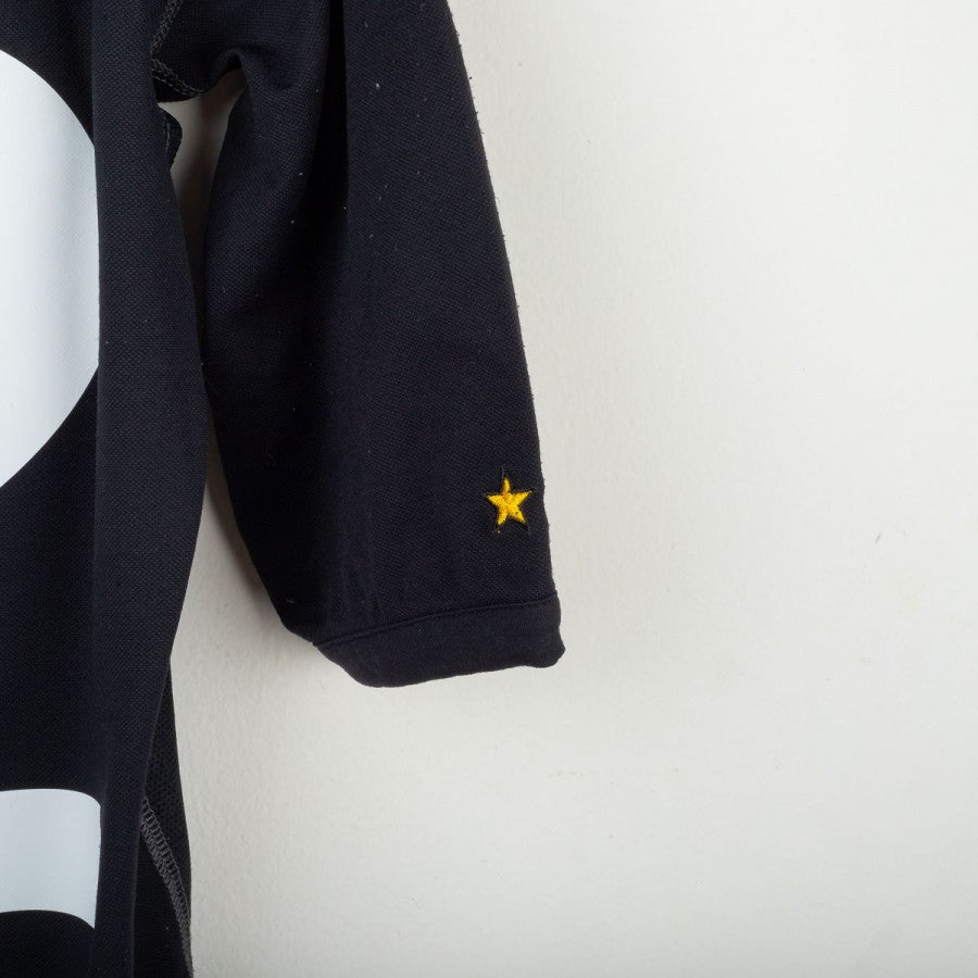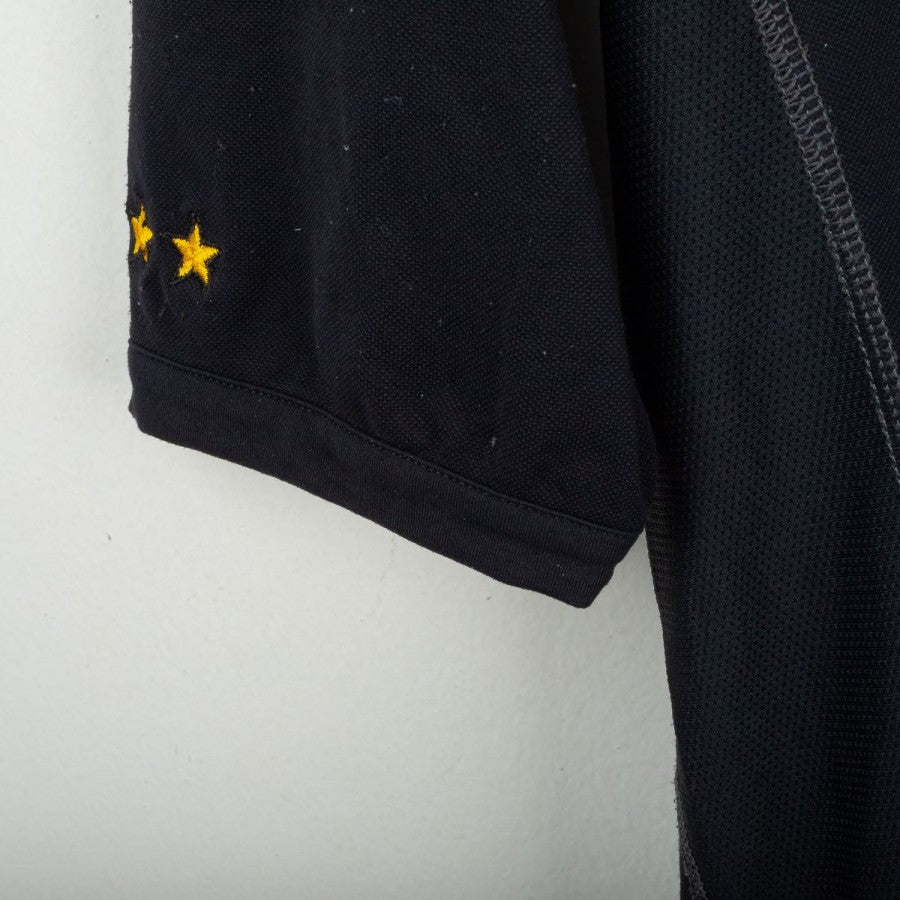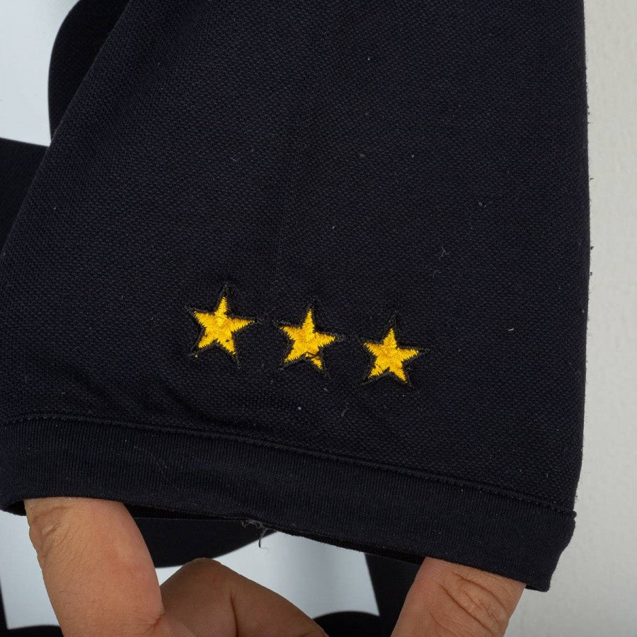 Maglia da portiere della Nazionale Italiana, stagione 2002, indossata da Francesco Toldo. Prodotta da Kappa, modello a maniche corte di colore nero. Logo Kappa bianco ricamato sulle maniche, stemma FIGC tricolore cucito sul petto. Numero 22 applicato fronte e retro in bianco, con nome Toldo sul retro. Dettaglio delle tre stelle ricamate in oro sulla manica, a rappresentare i titoli mondiali vinti dall'Italia fino ad allora. Vestibilità attillata in tessuto tecnico elasticizzato (92% poliammide, 8% lycra). Taglia XL.