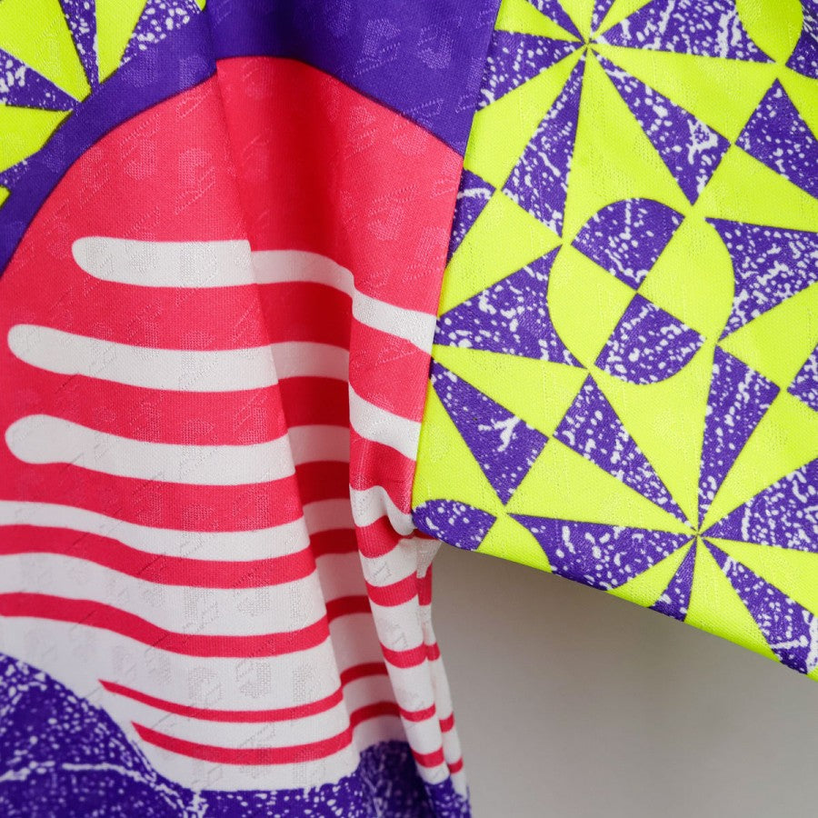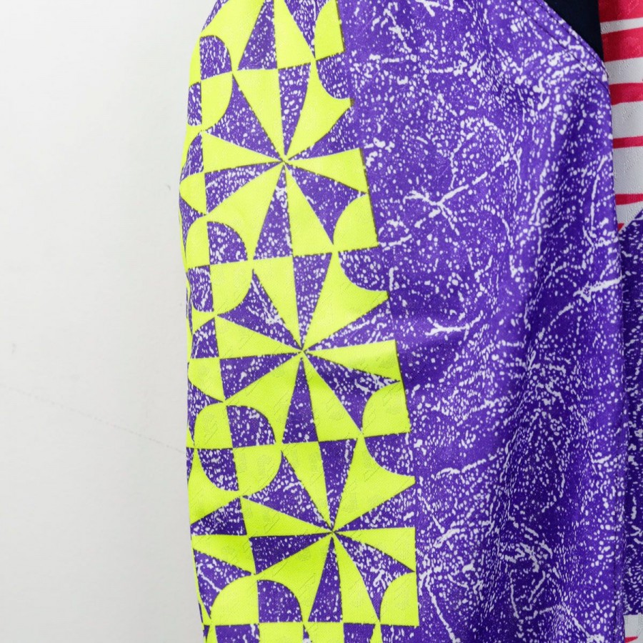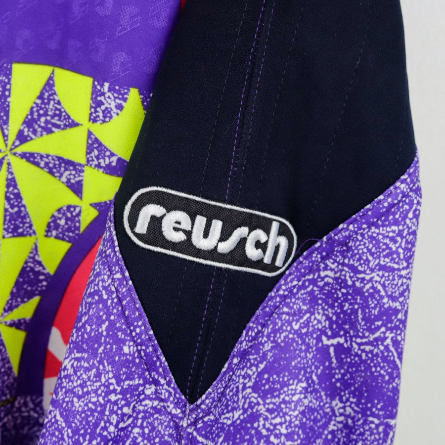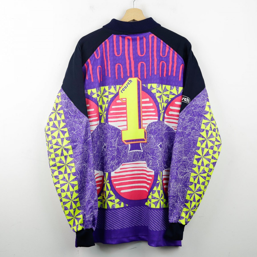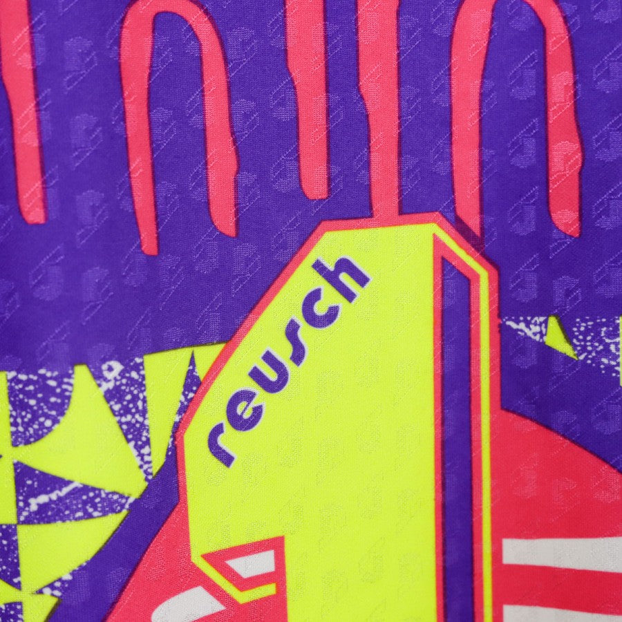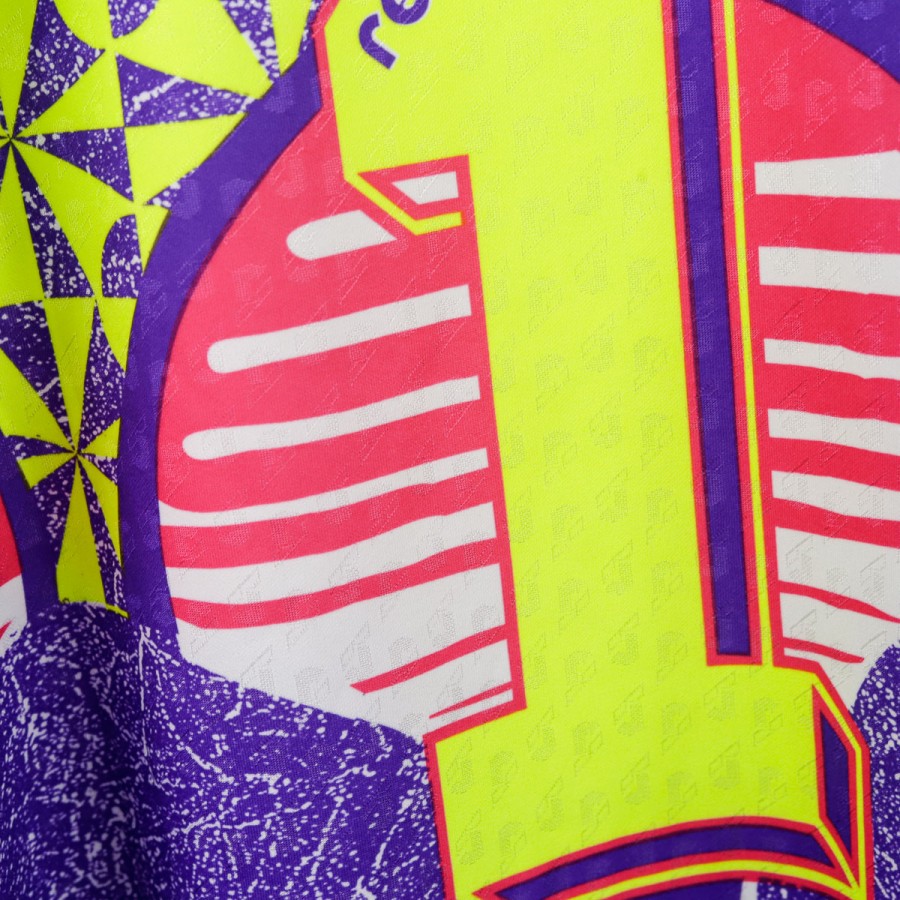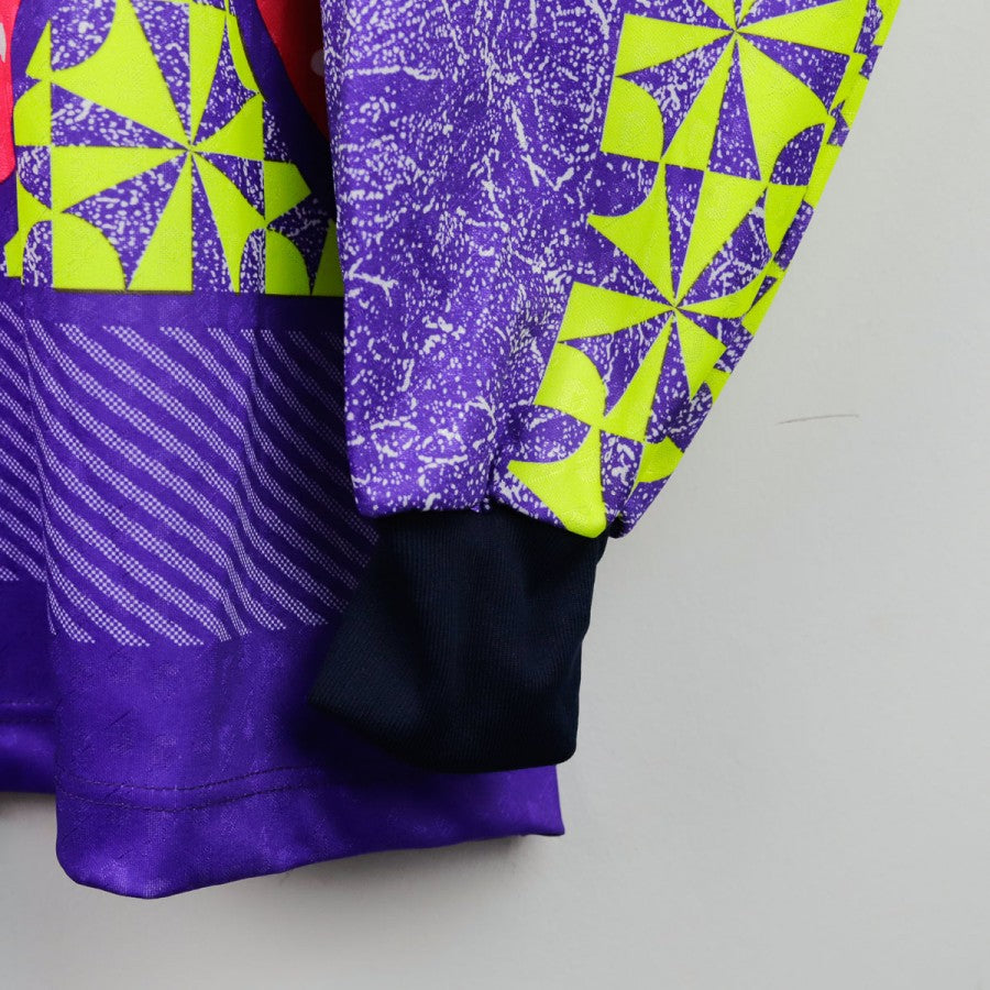 Maglia da portiere della Juventus, prodotta da Kappa per la stagione 1993/1994. Il design presenta un mix di colori vivaci come viola, giallo fluorescente e rosso, con motivi geometrici e dettagli astratti. Il colletto a polo e le maniche lunghe completano il look distintivo. Sulla parte destra del petto è presente il logo Kappa, mentre sul lato sinistro compare lo stemma della Juventus con le due stelle. Al centro della maglia è riportato lo sponsor commerciale Danone. Sul retro troviamo il numero 1 in giallo con contorno blu e il logo Reusch.