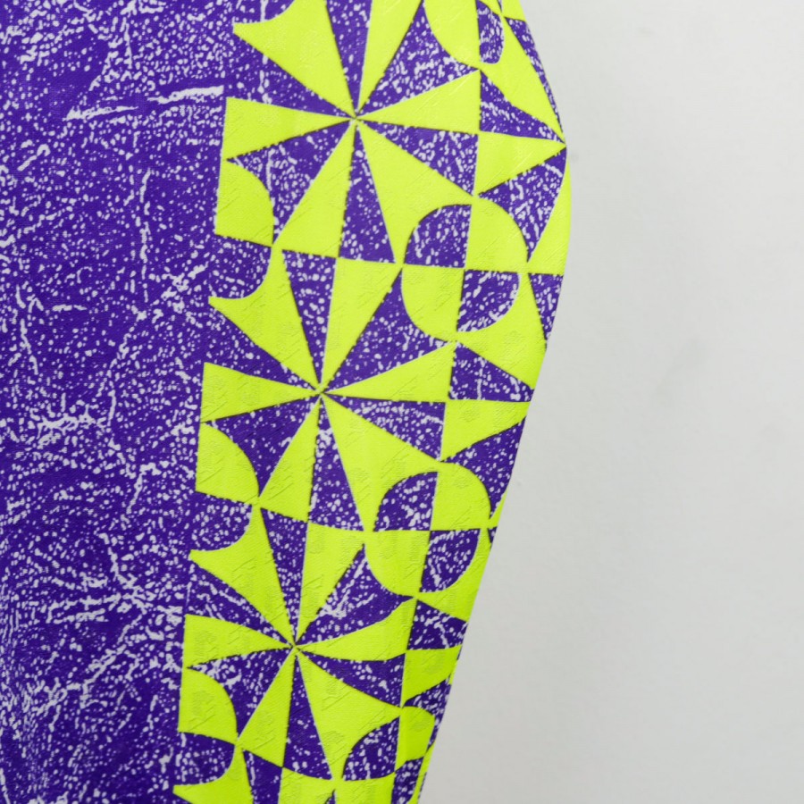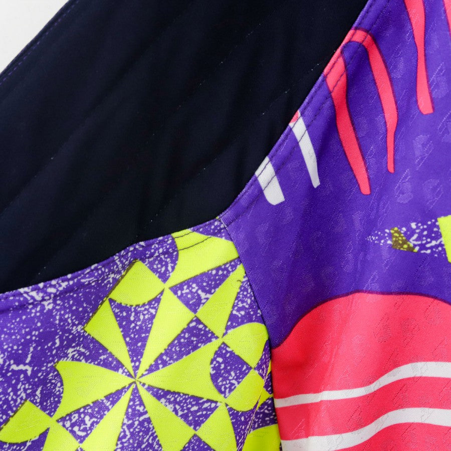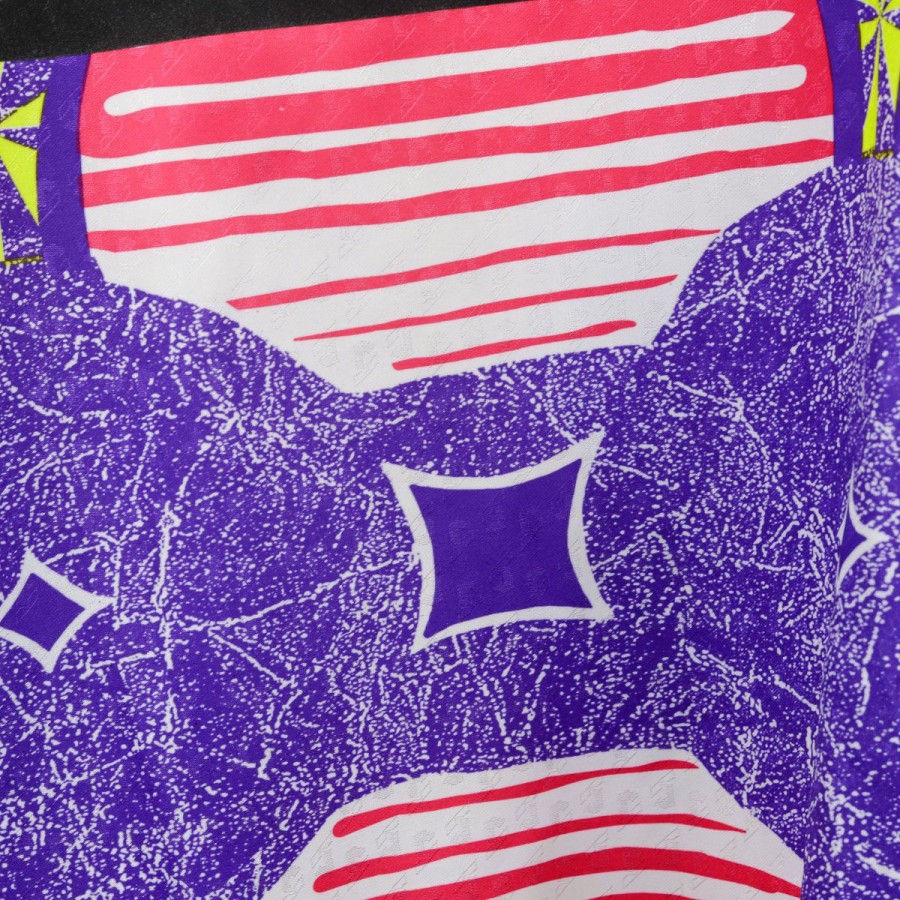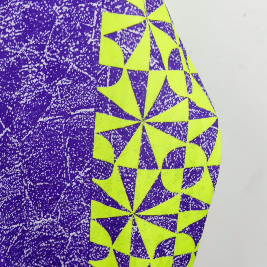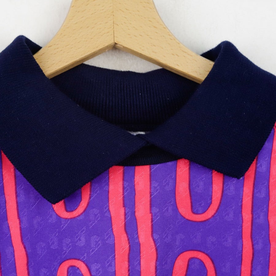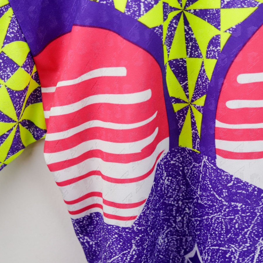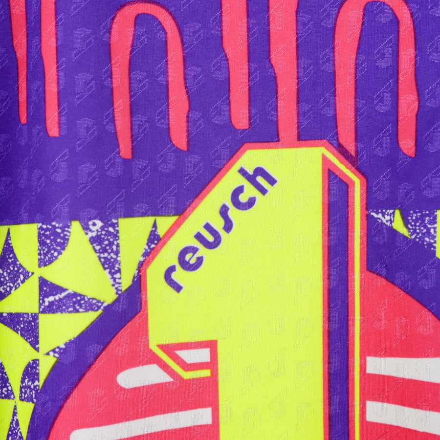 Maglia da portiere della Juventus, prodotta da Kappa per la stagione 1993/1994. Il design presenta un mix di colori vivaci come viola, giallo fluorescente e rosso, con motivi geometrici e dettagli astratti. Il colletto a polo e le maniche lunghe completano il look distintivo. Sulla parte destra del petto è presente il logo Kappa, mentre sul lato sinistro compare lo stemma della Juventus con le due stelle. Al centro della maglia è riportato lo sponsor commerciale Danone. Sul retro troviamo il numero 1 in giallo con contorno blu e il logo Reusch.