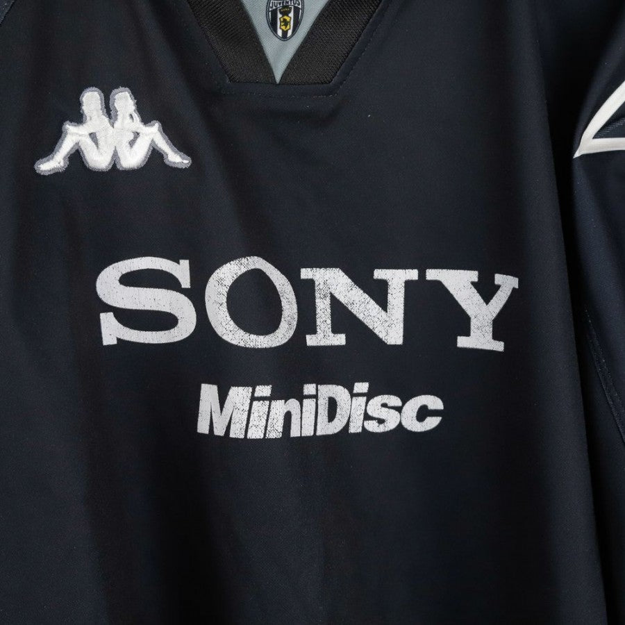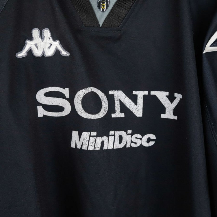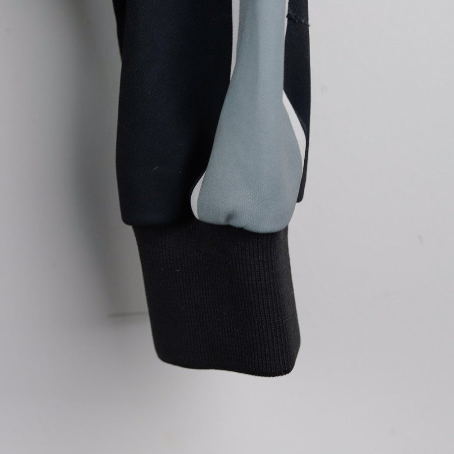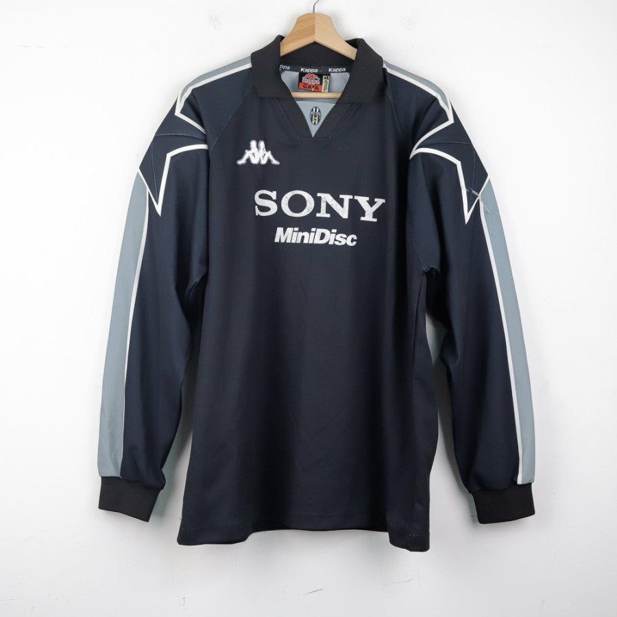 Maglia da portiere ufficiale della Juventus per la stagione 1996/1997, prodotta dallo sponsor tecnico Kappa. La divisa, indossata dal leggendario Angelo Peruzzi, presenta un design nero con dettagli grigi e bianchi sulle maniche e sulle spalle, creando un effetto dinamico e distintivo. Il logo Kappa è applicato sul petto e sulle maniche, mentre al centro spicca lo sponsor commerciale Sony MiniDisc. Sul retro, la maglia è personalizzata con il nome "Peruzzi" e il numero 1 in bianco. Modello a manica lunga, ideale per gli amanti del ruolo e del collezionismo.