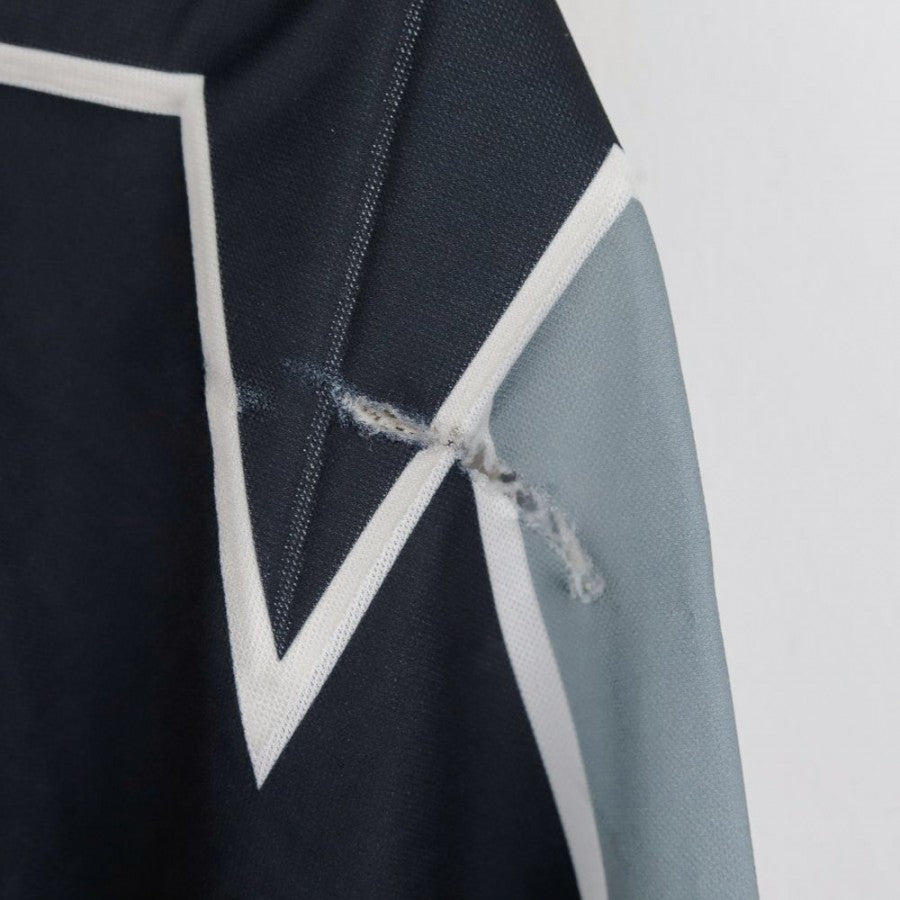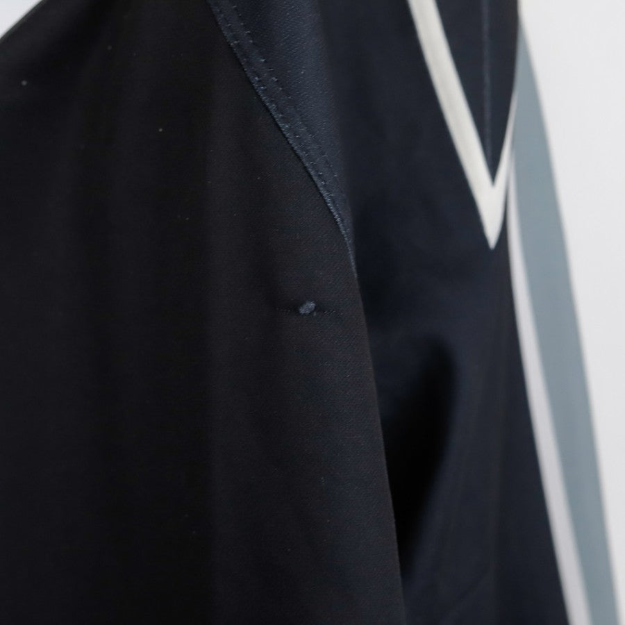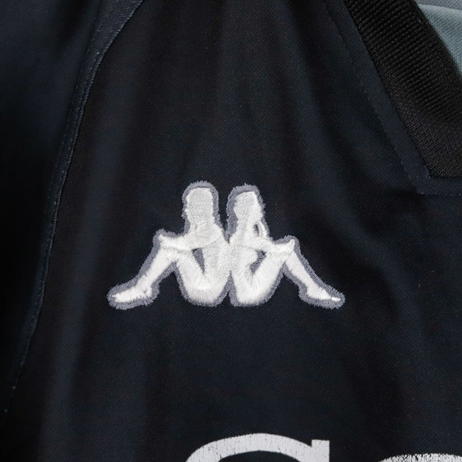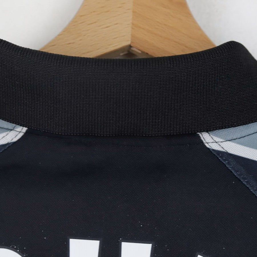 Maglia da portiere ufficiale della Juventus per la stagione 1996/1997, prodotta dallo sponsor tecnico Kappa. La divisa, indossata dal leggendario Angelo Peruzzi, presenta un design nero con dettagli grigi e bianchi sulle maniche e sulle spalle, creando un effetto dinamico e distintivo. Il logo Kappa è applicato sul petto e sulle maniche, mentre al centro spicca lo sponsor commerciale Sony MiniDisc. Sul retro, la maglia è personalizzata con il nome "Peruzzi" e il numero 1 in bianco. Modello a manica lunga, ideale per gli amanti del ruolo e del collezionismo.