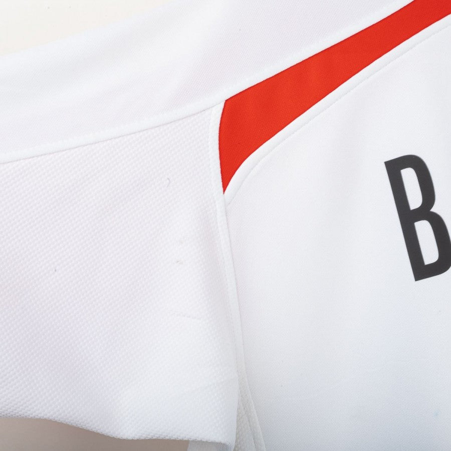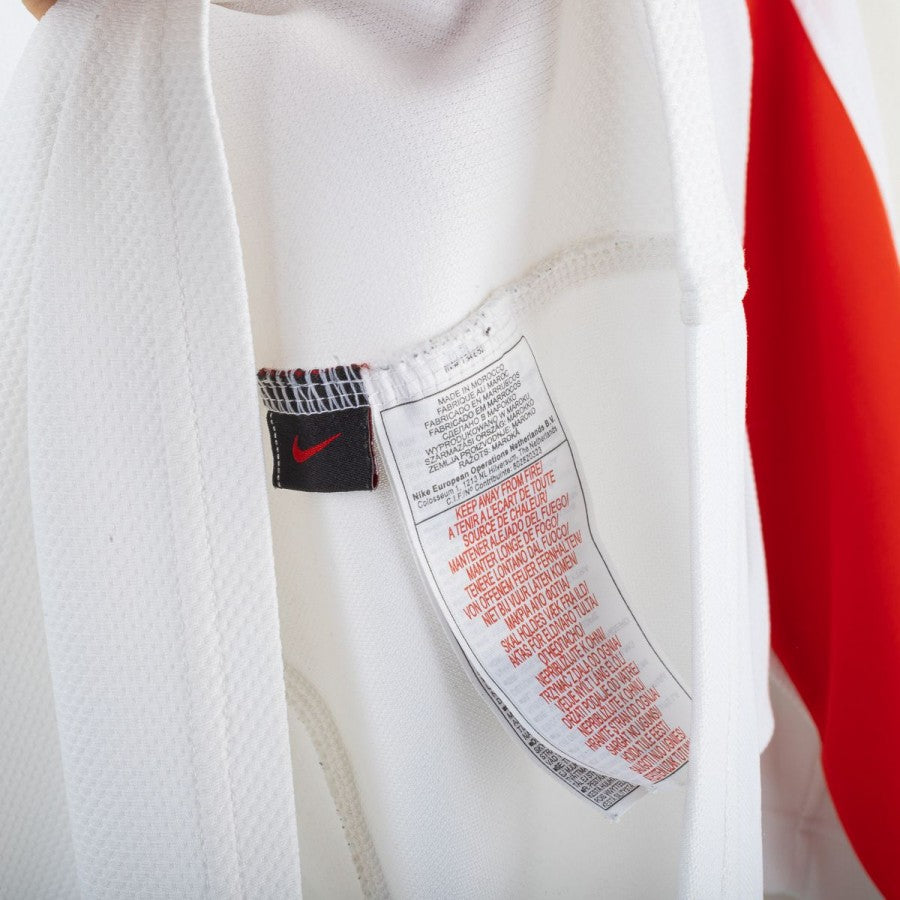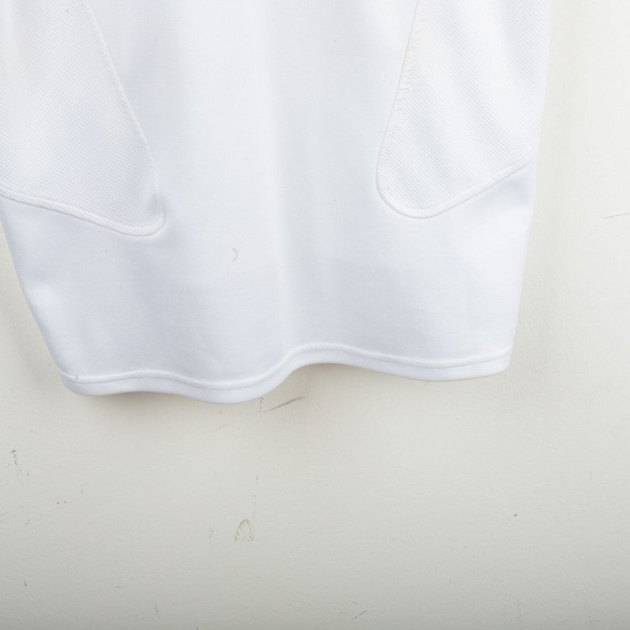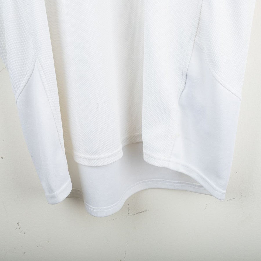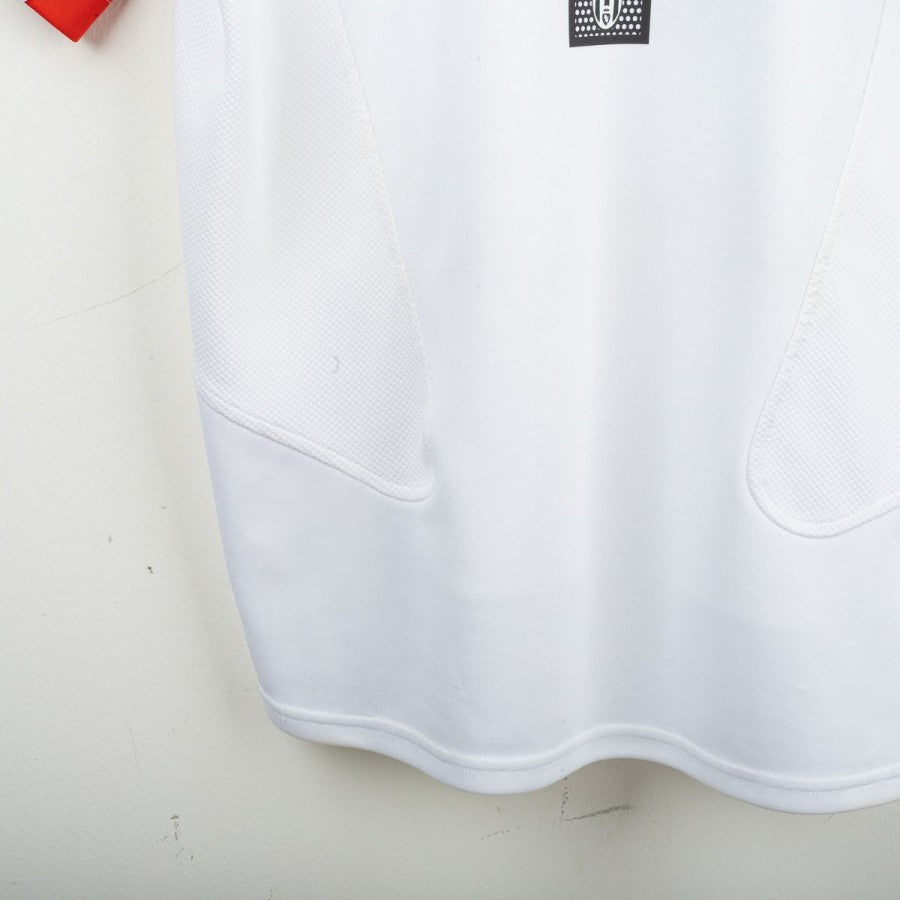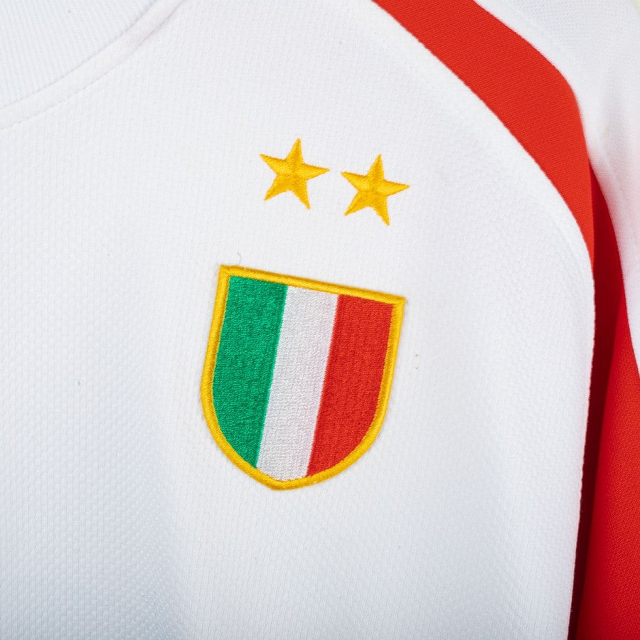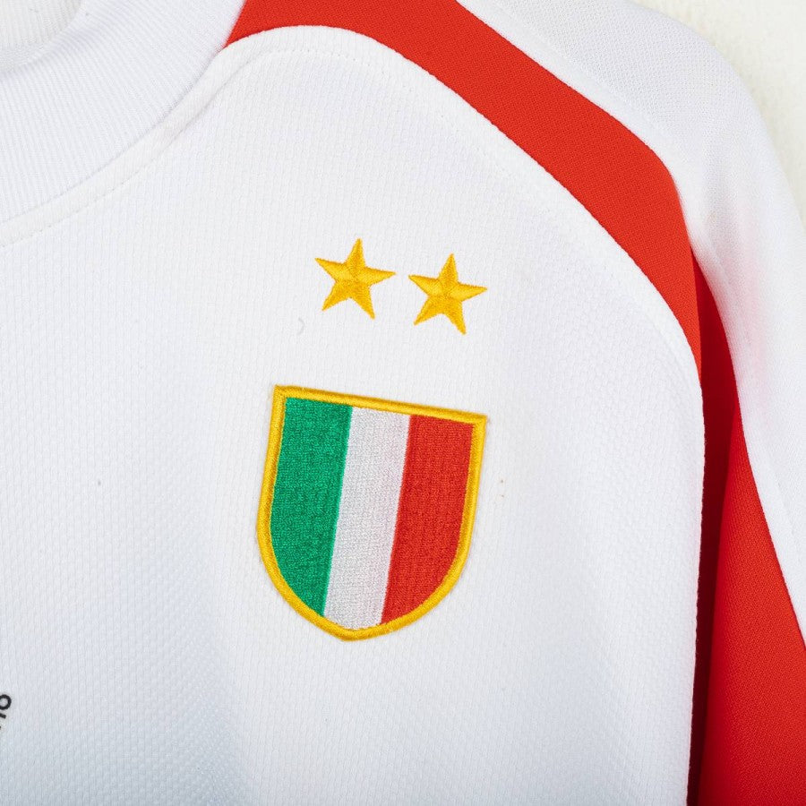 Maglia da portiere della Juventus prodotta da Nike per la stagione 2005/2006, indossata da Gianluigi Buffon, con personalizzazione numero 1. Modello bianco con inserti verdi e rossi sulle maniche che richiamano la bandiera italiana. Sul petto stemma Juventus celebrativo del Centenario del 1° Scudetto (1905-2005), logo Nike ricamato e sponsor Tamoil centrale. Sul lato cuore scudetto tricolore con due stelle. Sul retro nome “BUFFON” e numero 1 stilizzato in nero. Vestibilità regolare. Taglia L.