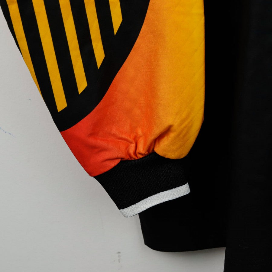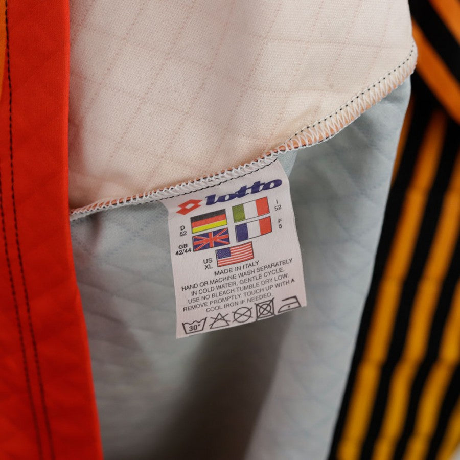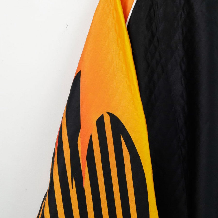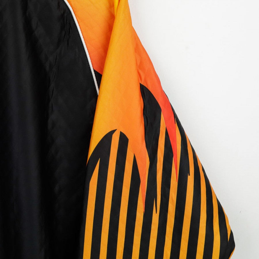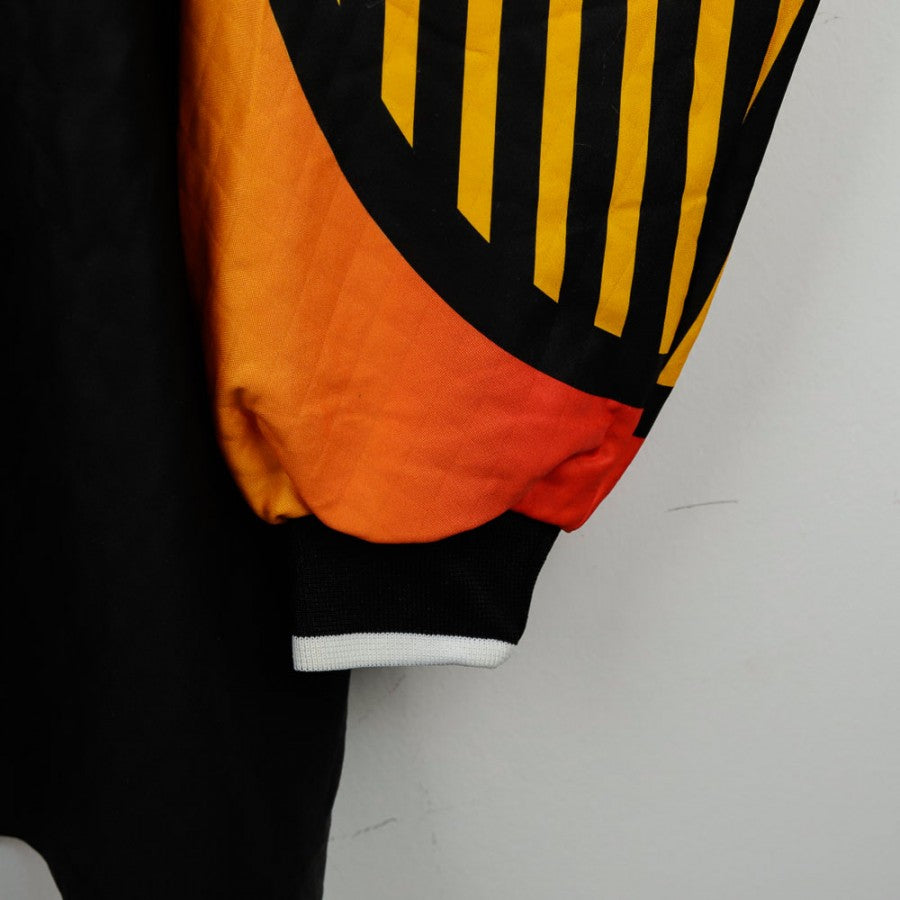 Maglia Portiere Napoli Lotto 1996/1997. Realizzata da Lotto, questa iconica maglia da portiere è caratterizzata da una vivace grafica fiammeggiante nelle tonalità arancio e rosso con inserti neri, che si estende sulle maniche imbottite, perfetta rappresentazione dello stile anni '90. Lo stemma SSC Napoli è posizionato centralmente sotto il colletto nero, mentre il logo tecnico Lotto è ben visibile sia frontalmente che sul retro del collo. La taglia visibile è XL. Da notare la presenza del logo di Batman stilizzato sul petto, in riferimento al soprannome del portiere Giuseppe Taglialatela, affettuosamente chiamato "Batman" dai tifosi per le sue parate acrobatiche.