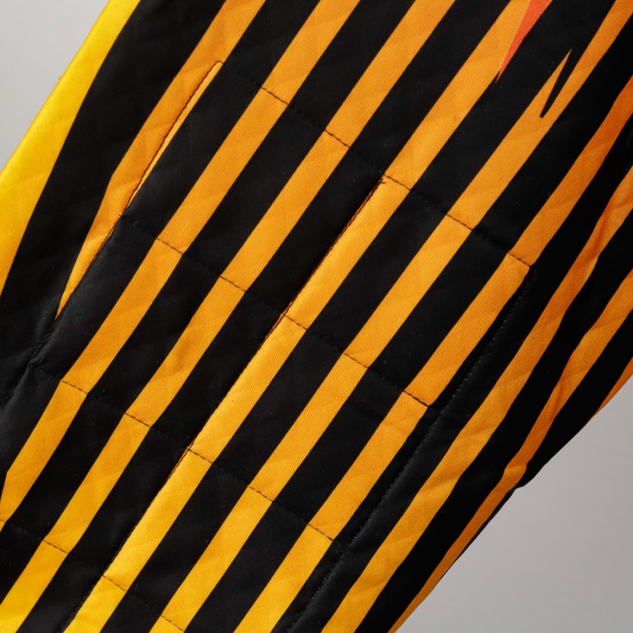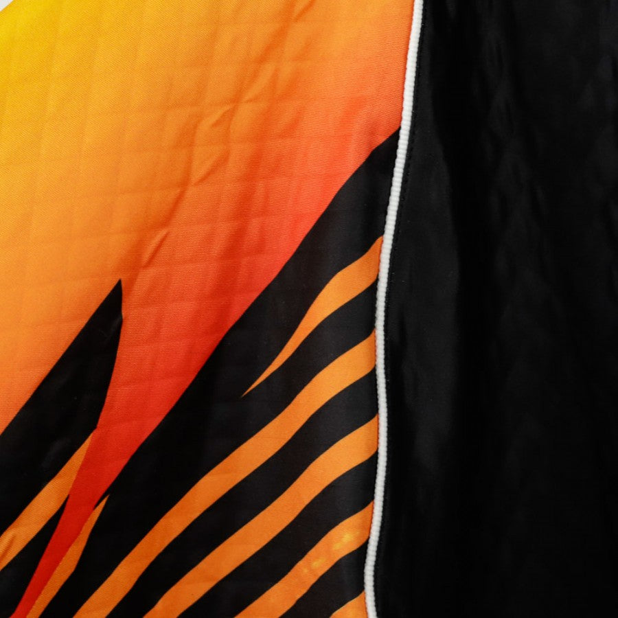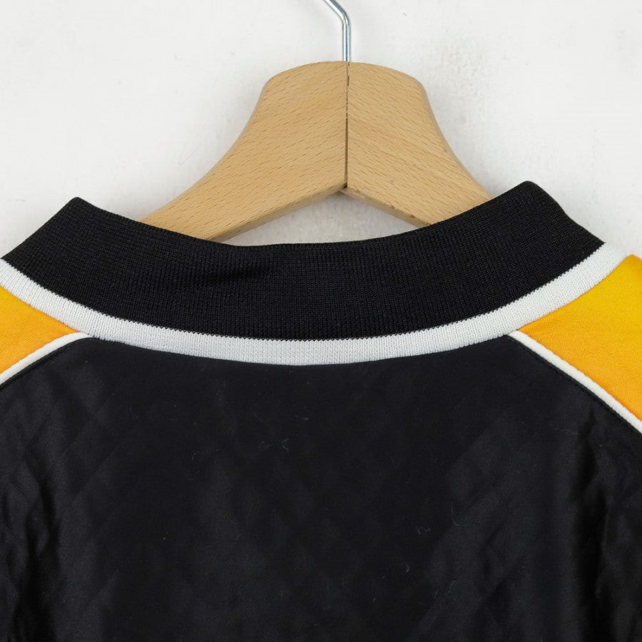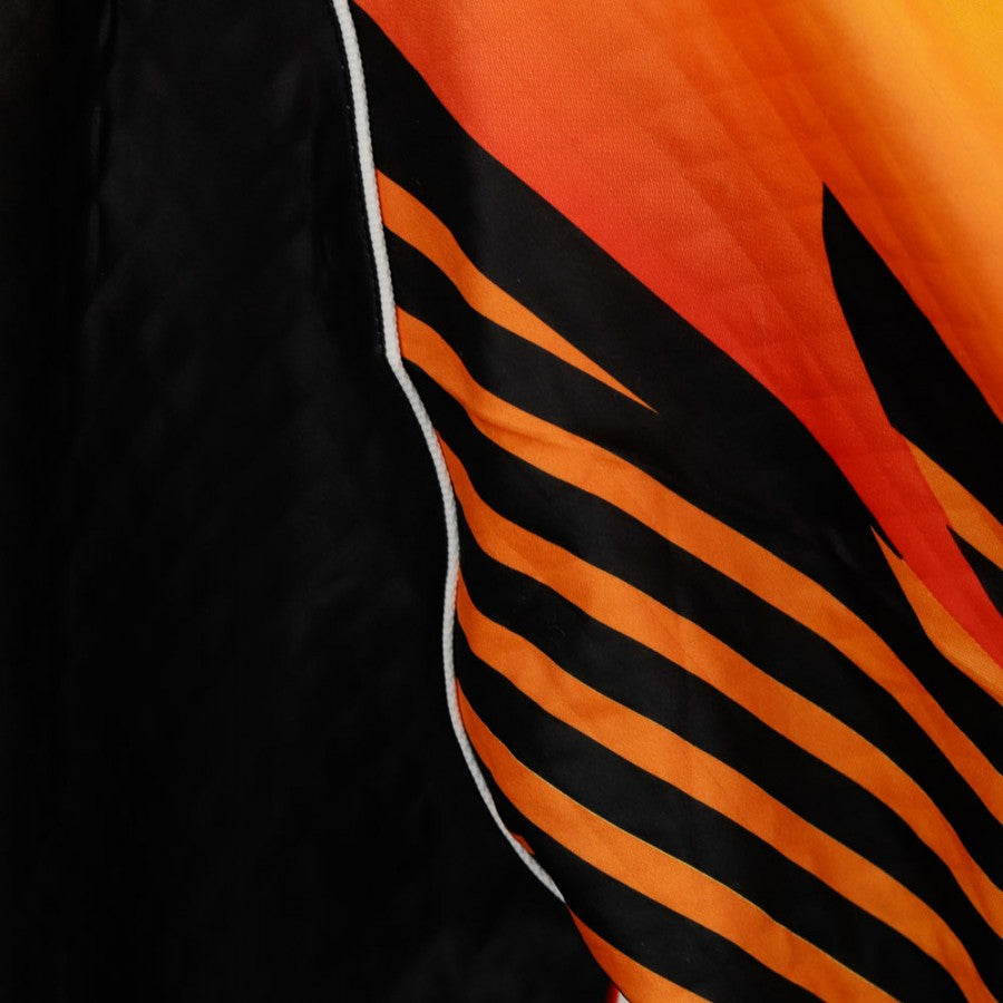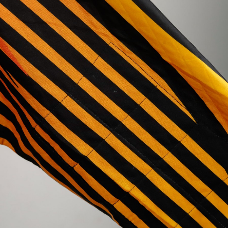 Maglia Portiere Napoli Lotto 1996/1997. Realizzata da Lotto, questa iconica maglia da portiere è caratterizzata da una vivace grafica fiammeggiante nelle tonalità arancio e rosso con inserti neri, che si estende sulle maniche imbottite, perfetta rappresentazione dello stile anni '90. Lo stemma SSC Napoli è posizionato centralmente sotto il colletto nero, mentre il logo tecnico Lotto è ben visibile sia frontalmente che sul retro del collo. La taglia visibile è XL. Da notare la presenza del logo di Batman stilizzato sul petto, in riferimento al soprannome del portiere Giuseppe Taglialatela, affettuosamente chiamato "Batman" dai tifosi per le sue parate acrobatiche.