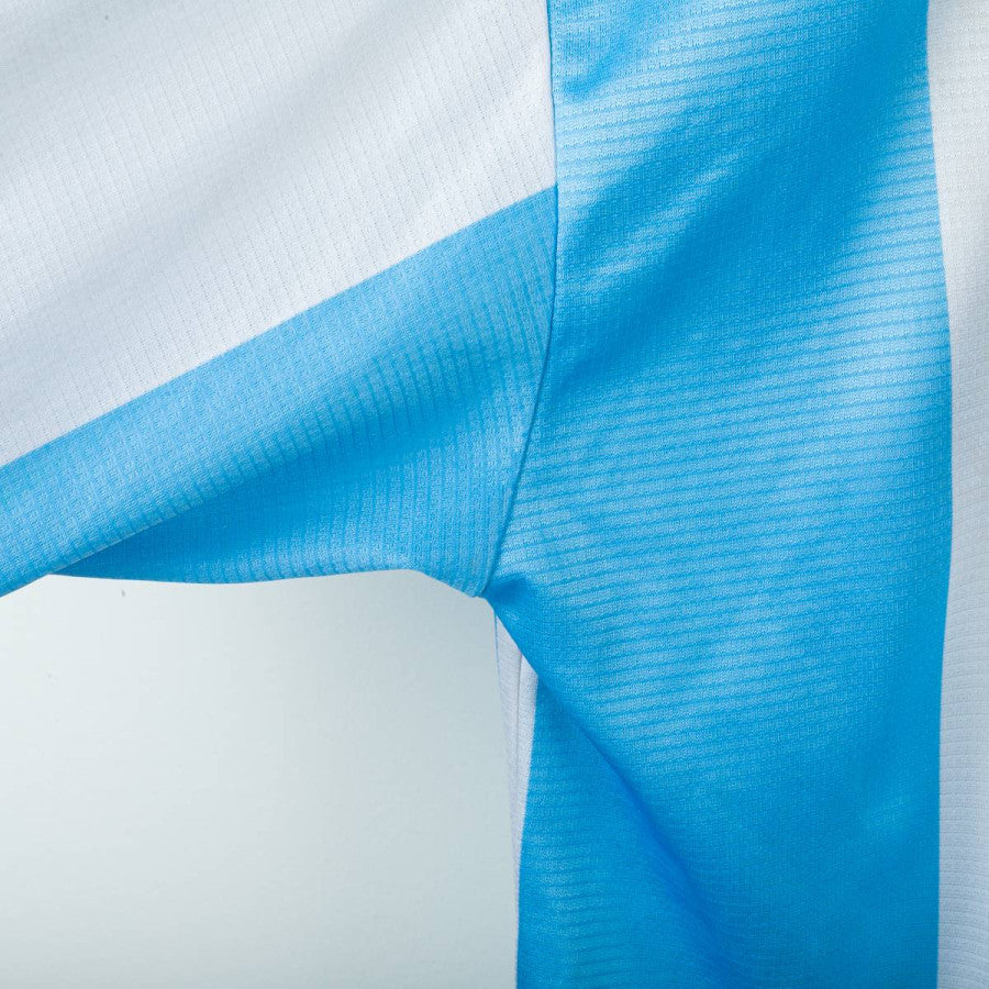 Maglia speciale della S.S. Lazio utilizzata nella stagione 1999/2000, realizzata da Puma per celebrare il centenario del club. Design ispirato ai colori della bandiera argentina, con bande verticali biancocelesti e dettagli gialli sul colletto e sui bordi manica. Logo Puma applicato in vellutino flock nero, stemma della Lazio cucito lato cuore. Sponsor Del Monte applicato in stampa floccata. Nome Verón e numero 23 sul retro applicati in flock. Colletto a polo con scritta interna “S.S. LAZIO”. Tessuto tecnico leggero in poliestere con inserti traspiranti. Vestibilità regolare. Taglia L.
