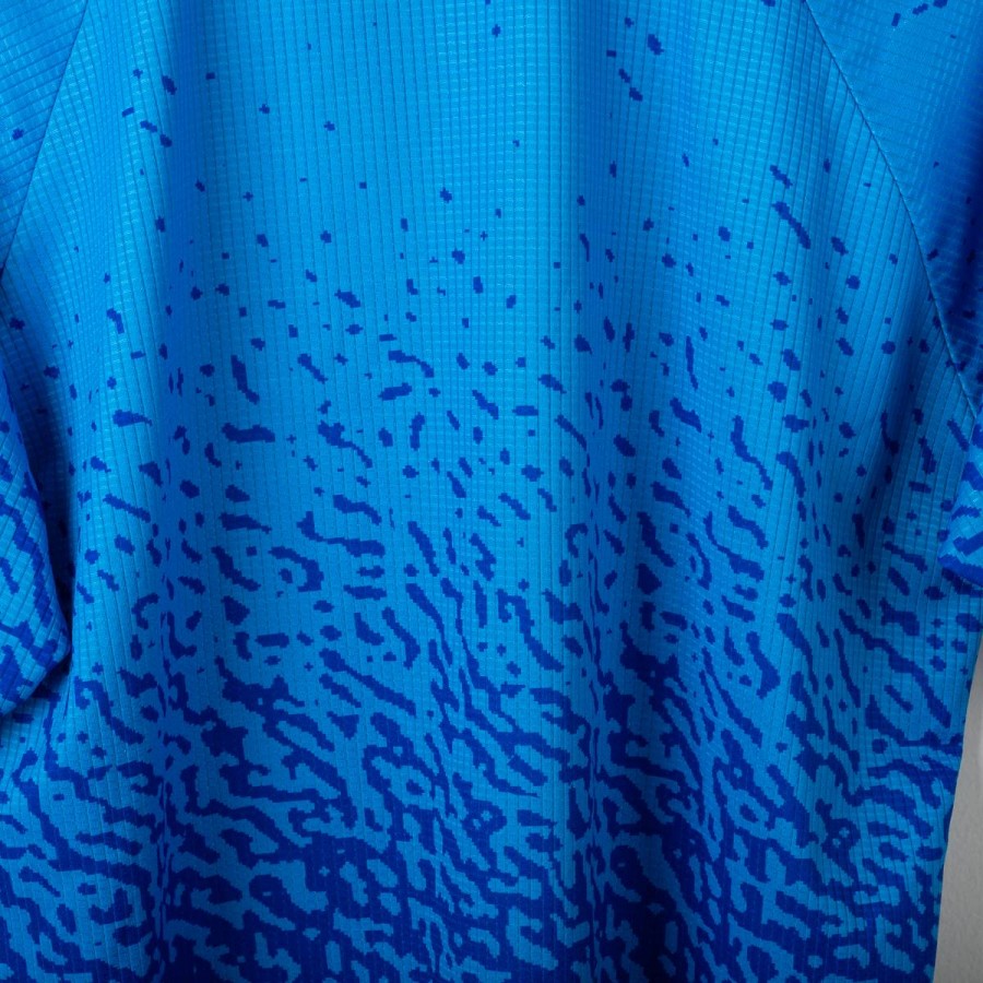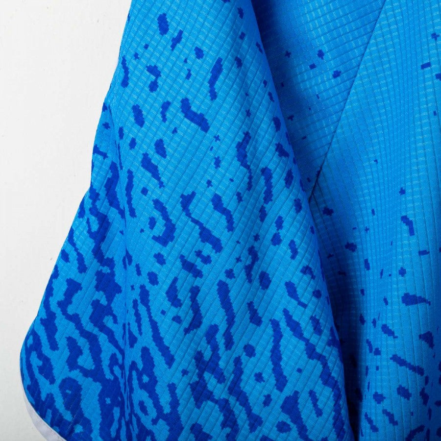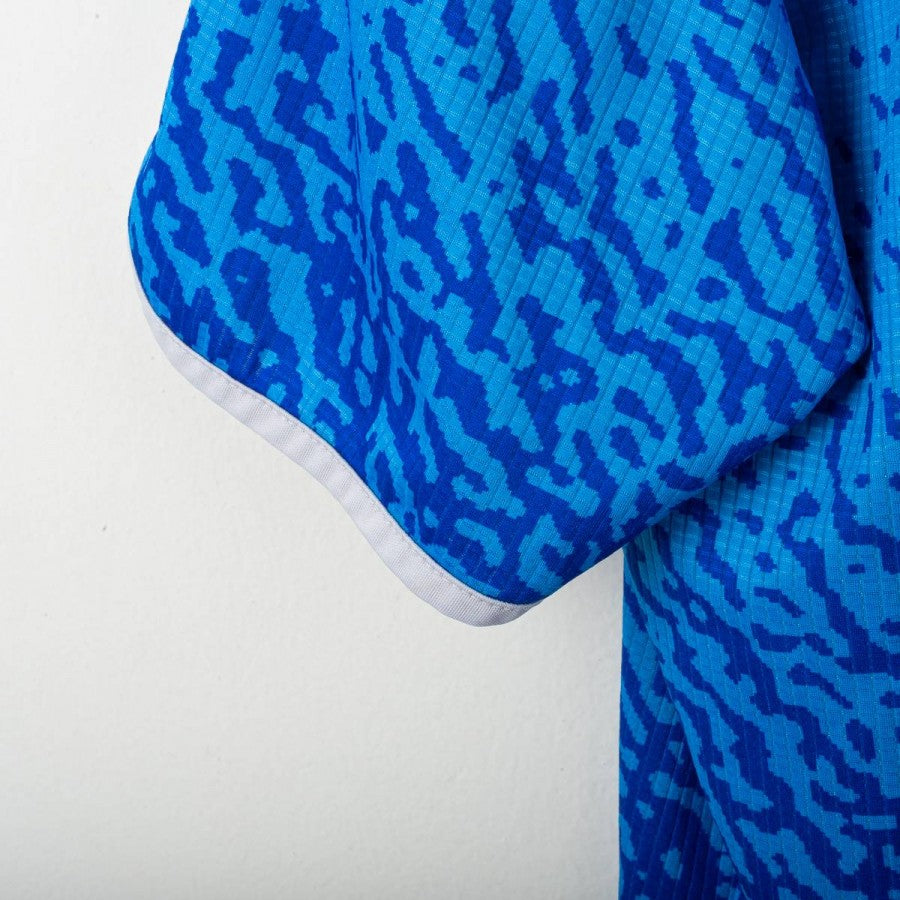 Maglia Supporter Azzurri Diadora 1994 realizzata in collaborazione con Ferrero, caratterizzata da un vivace design a effetto pixel sfumato su base azzurra. Sul fronte troviamo lo stemma celebrativo con tre stelle, lo sponsor commerciale "Supporter Azzurri" e il logo Diadora, storico sponsor tecnico della Nazionale Italiana. La taglia indicata è L.