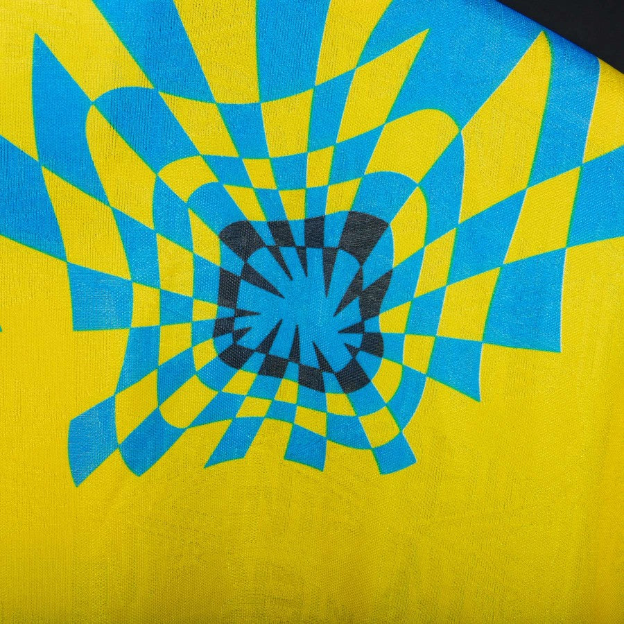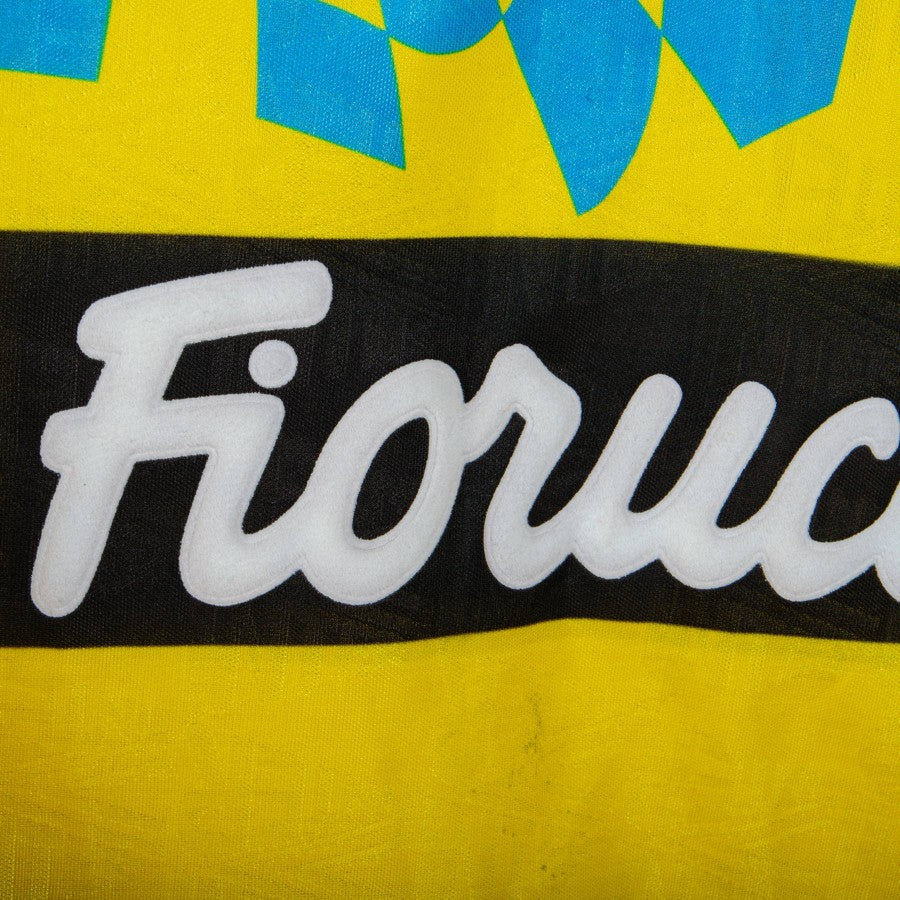 Modello a maniche corte di colore giallo con pattern geometrico nerazzurro centrato sulla parte destra. Stemma squadra sul cuore e logo Umbro lato opposto. In basso troviamo lo sponsor commerciale Fiorucci.