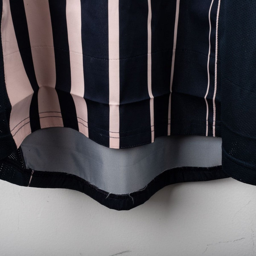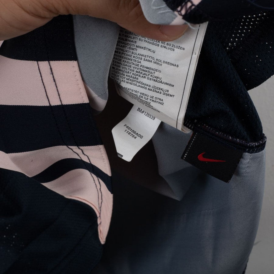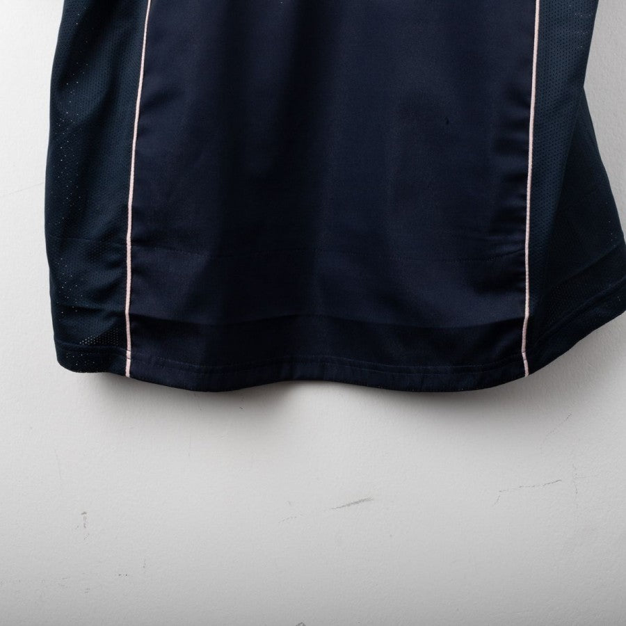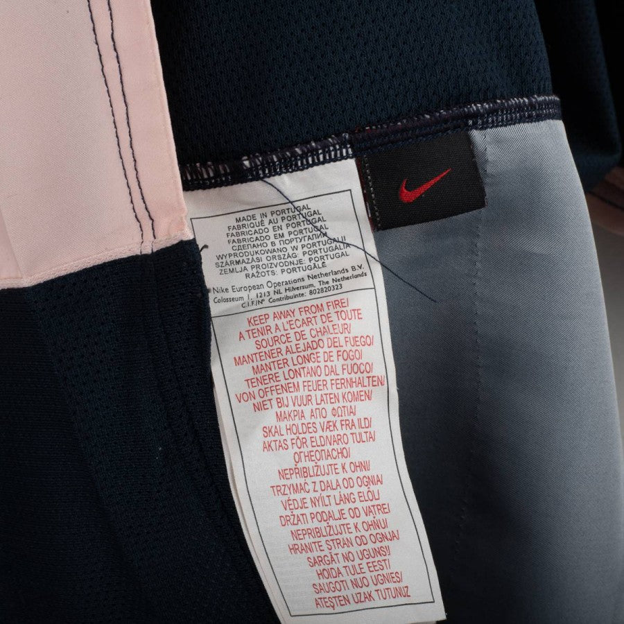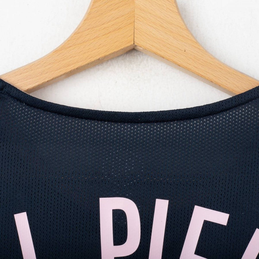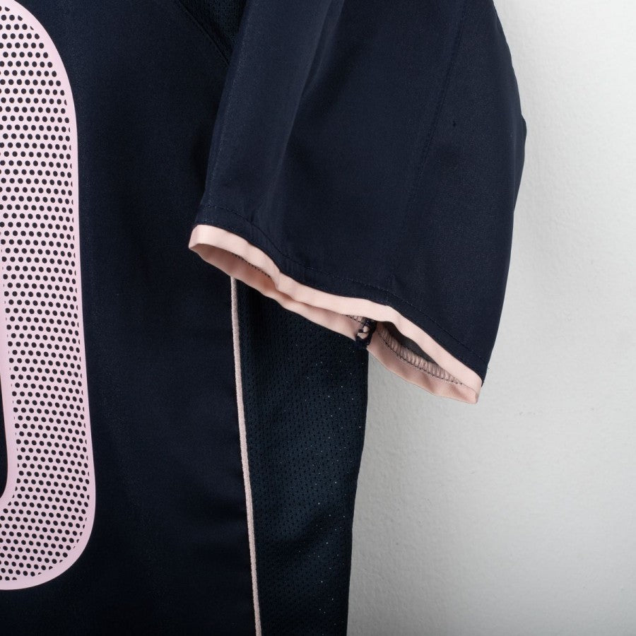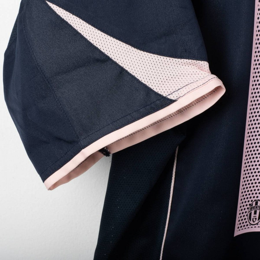 Maglia Third Juventus Nike Del Piero 10 2004/2005. Realizzata da Nike con un design innovativo a righe verticali rosa su fondo blu scuro, questa maglia è una delle versioni third più riconoscibili del club bianconero. Presenta lo sponsor tecnico Nike e lo sponsor commerciale Sky Sport. Il numero 10 e il nome Del Piero sono ben visibili sul retro. La taglia indicata è L.