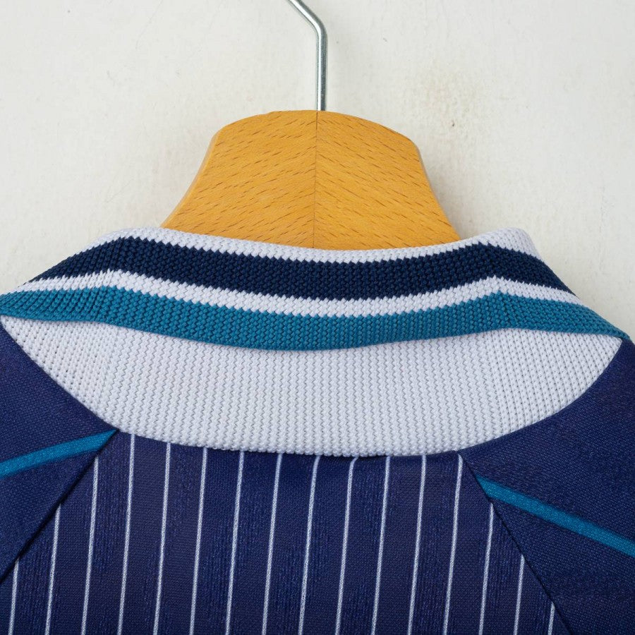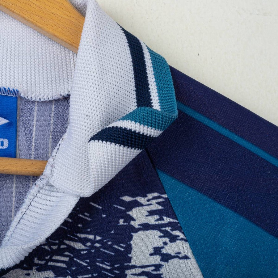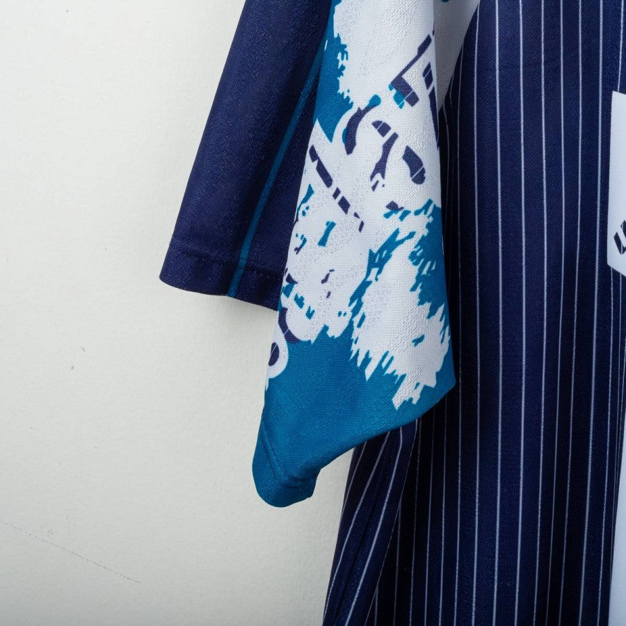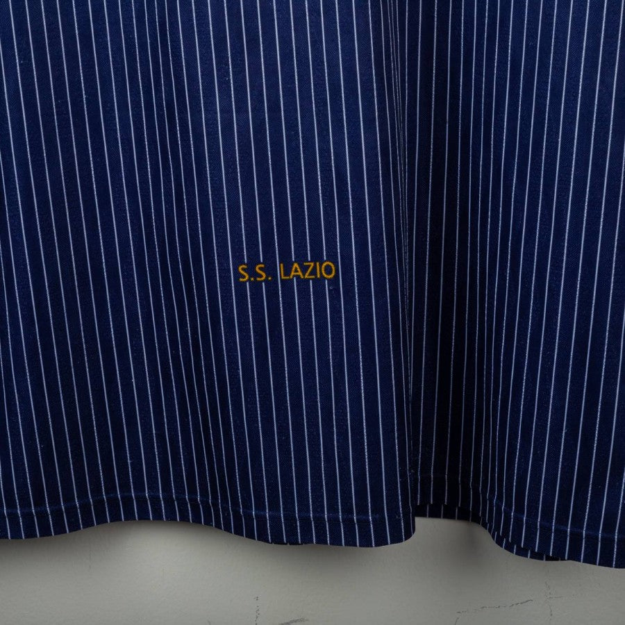 Maglia third della S.S. Lazio indossata nella stagione 1996/1997, prodotta da Umbro. Design a righe verticali bianche su sfondo blu, con inserti azzurri sulle maniche e motivi grafici bianchi sul petto. Stemma societario ricamato lato cuore. Logo Umbro stampato in sublimatico sul lato destro del petto. Sponsor centrale “CIRIO” in flock bianco con bordo verde per il logo supplementare. Nome “NEDVED” e numero 18 in bianco sul retro, con loghi Umbro all'interno dei numeri. Colletto a polo bianco con inserti blu e azzurri. Vestibilità regolare. Taglia XL.