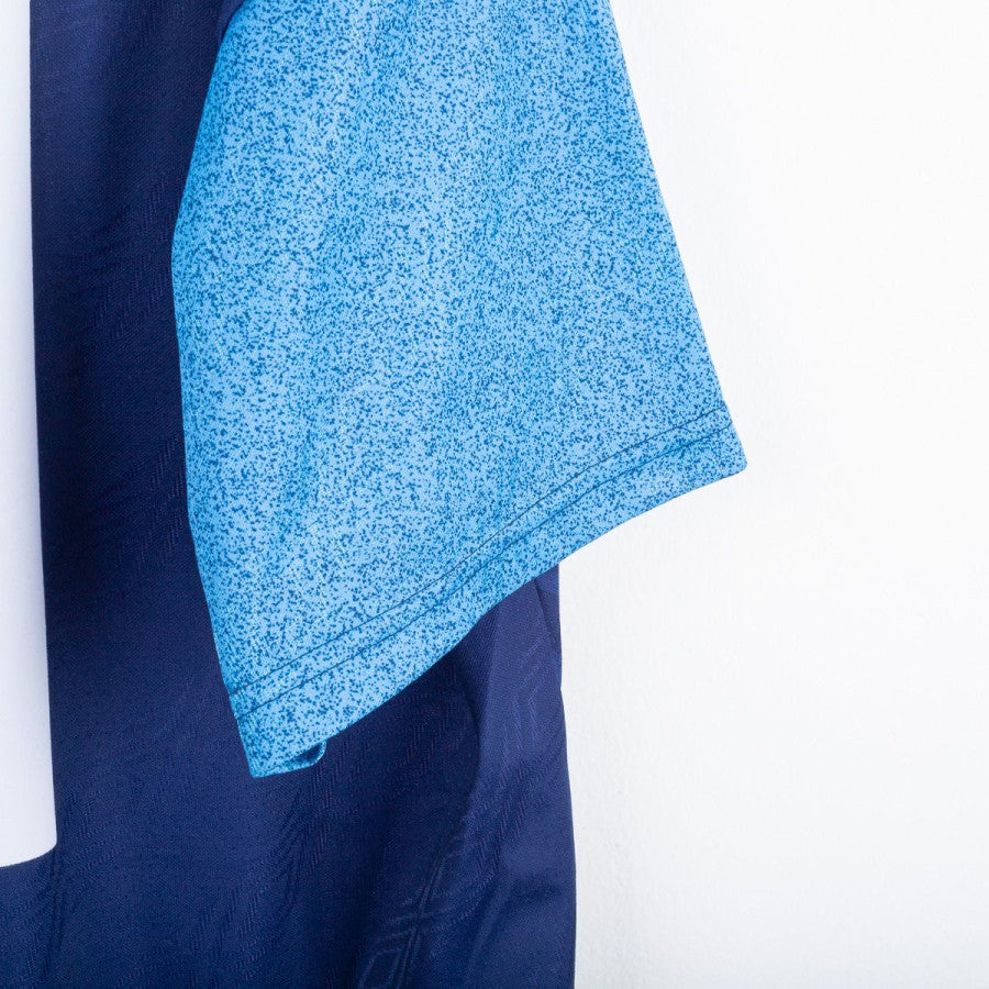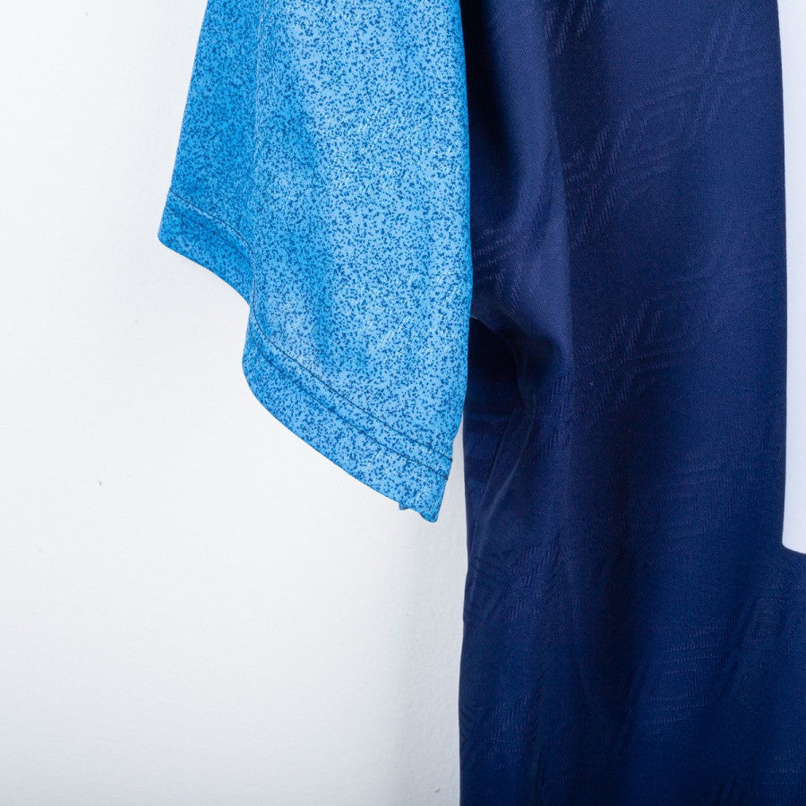 Maglia ufficiale Third della S.S. Lazio stagione 1996/1997 realizzata da Umbro. Splendido design con base blu navy e fulmine azzurro a contrasto, sponsor Banca di Roma stampato al centro e logo Umbro e stemma Lazio ricamati sul petto. Sul retro nome Signori e numero 11 in stampa floccata bianca. Taglia XL.