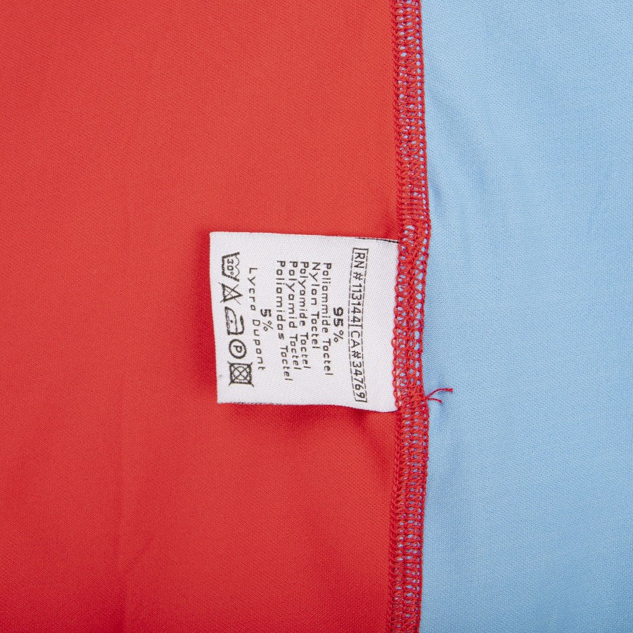 La maglia presenta un evidente strappo sulla parte frontale. In linea di massima il colore rosso rutilante rimane fedele al colore di fabbrica. Non presenta aloni. Taglia XXL
