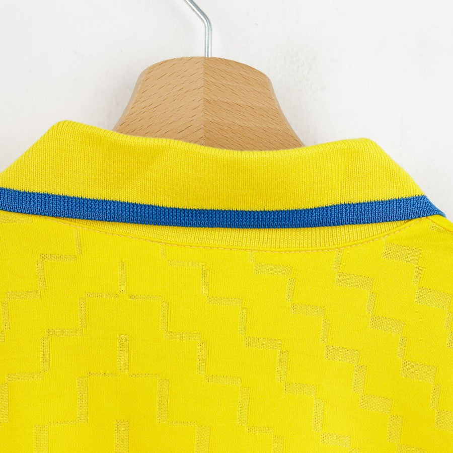 Maglia Third del Napoli utilizzata nella stagione 1995/1996, realizzata da Lotto e contraddistinta dal numero 7 sul retro. Il logo tecnico Lotto è presente sul petto, insieme allo stemma SSC Napoli e allo sponsor commerciale Record Cucine. Il design presenta una base gialla brillante con una banda orizzontale azzurra, texture geometrica in rilievo e colletto a polo con rifiniture azzurre. Modello a maniche lunghe. Taglia L visibile sull'etichetta interna.