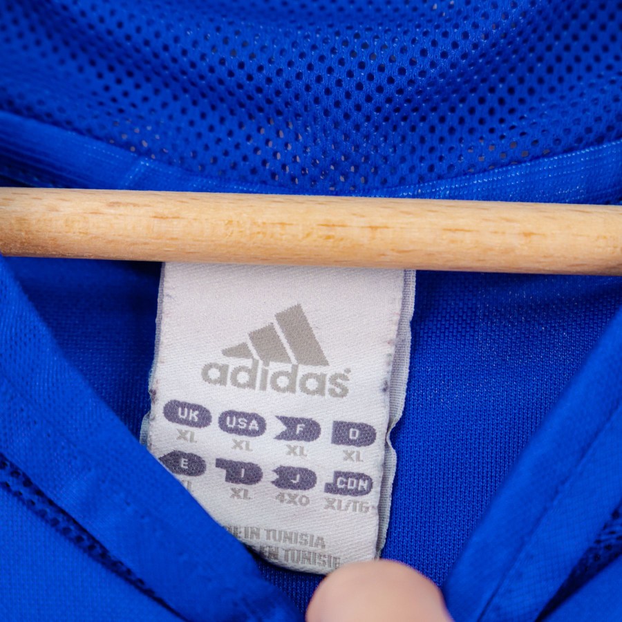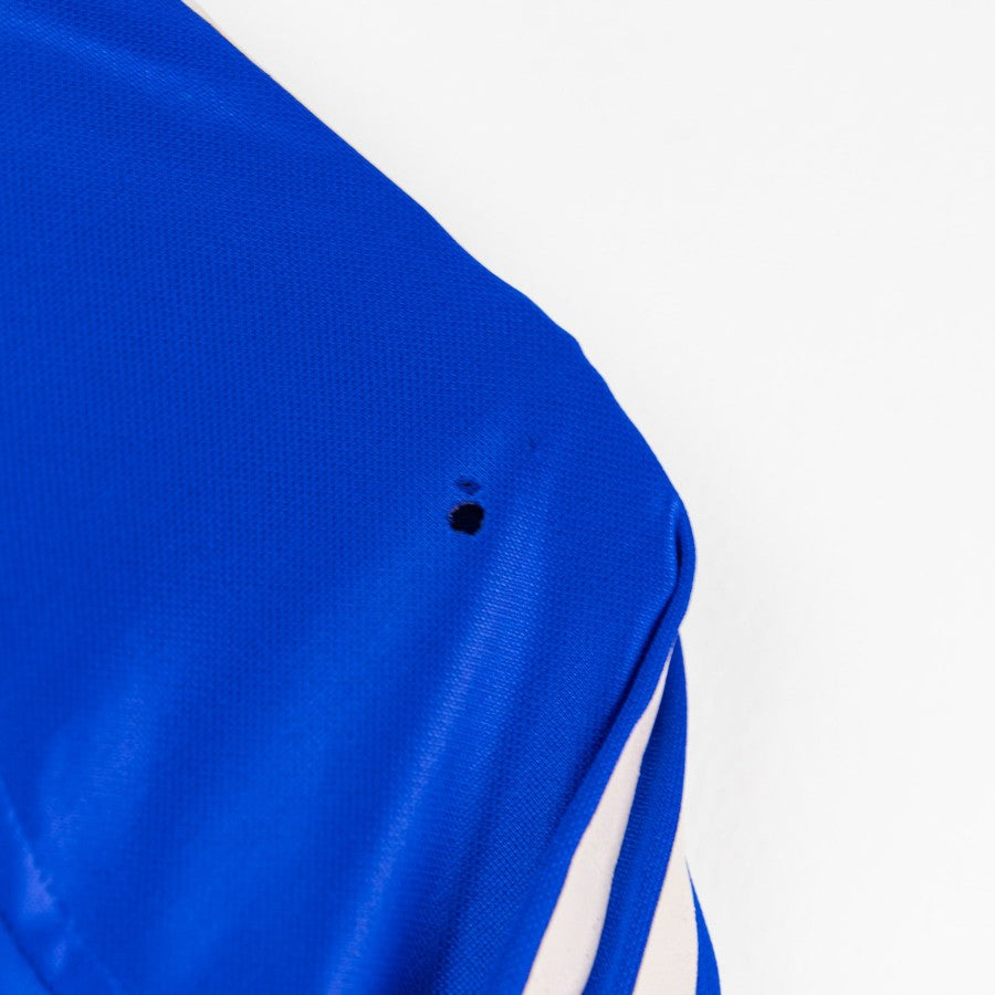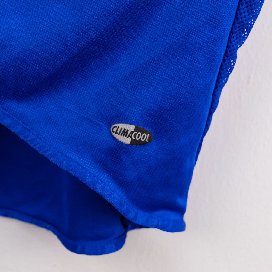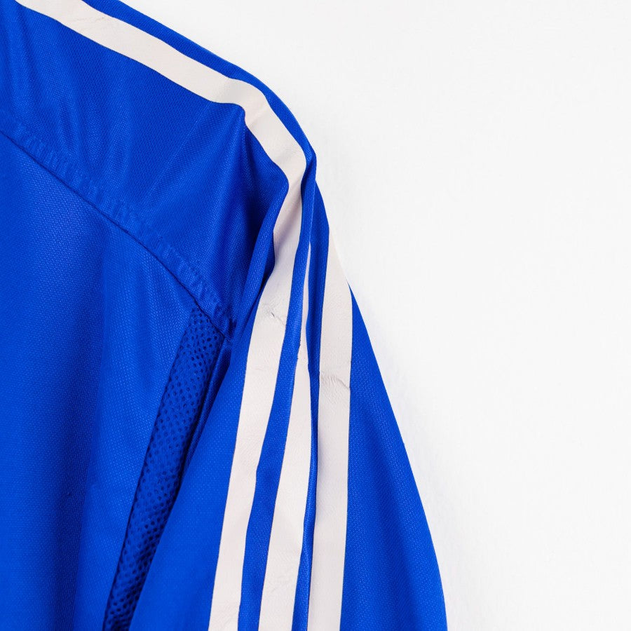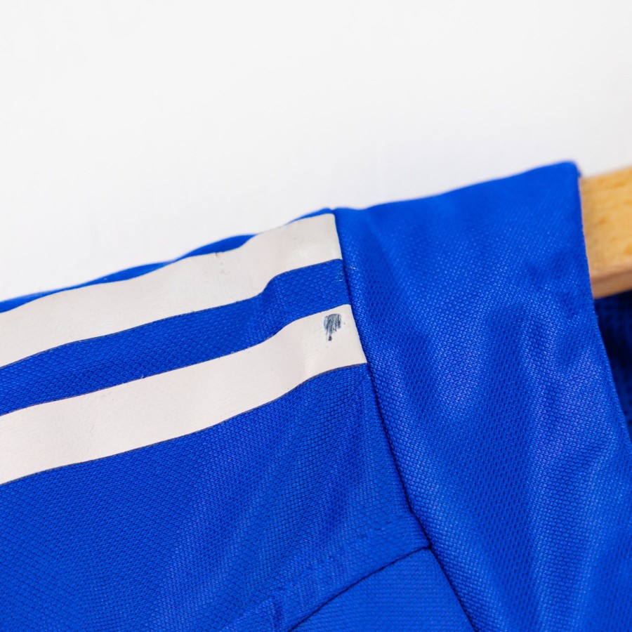 Modello a maniche corte di colore blu con colletto a V. Lato cuore troviamo lo stemma della squadra, dall'altra parte il logo Adidas ricamato in bianco.
