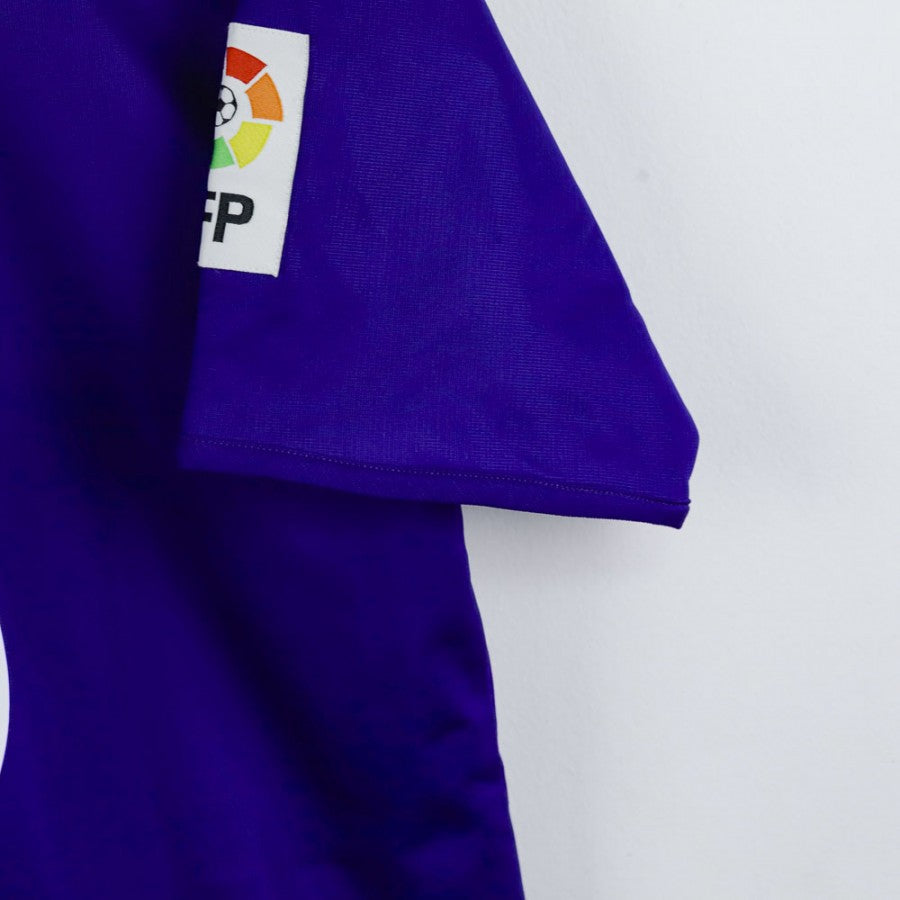 Maglia ufficiale Third del Real Madrid per la stagione 2002/2003, prodotta dallo sponsor tecnico Adidas e personalizzata con il nome di Zinedine Zidane e il numero 5. La maglia, di taglia S, è di colore viola con dettagli in bianco ed è impreziosita dalla toppa ufficiale della Liga applicata sulla manica destra. Lo stemma del Real Madrid è ricamato sul petto lato cuore, affiancato dal logo Adidas. Questo modello rappresenta una delle stagioni più memorabili del Real Madrid, in cui Zidane consolidò il suo status di leggenda con il suo straordinario talento e visione di gioco.