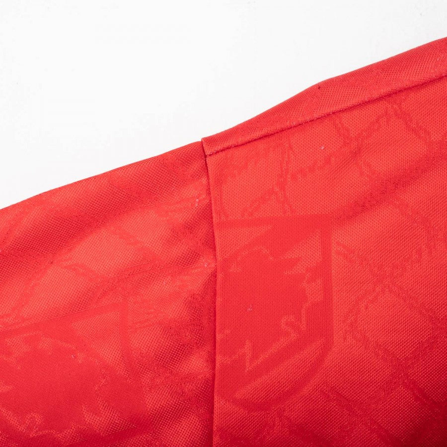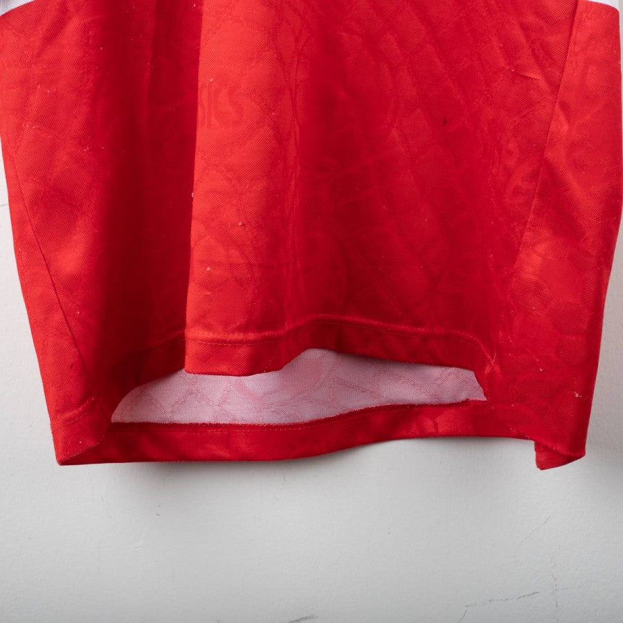 Maglia Third Sampdoria Asics Chiesa 20 1995/1996. Prodotta da Asics, questa maglia si presenta con l'iconica banda blucerchiata centrale su fondo rosso, colletto a polo con righe tricolori e chiusura con bottone. Trama geometrica tono su tono e dettagli curati rendono questo modello uno dei più apprezzati degli anni '90. Presenta lo sponsor tecnico Asics e lo sponsor commerciale Nuova Tirrena. Sul retro sono riportati il nome Chiesa e il numero 20. La taglia indicata è M.
