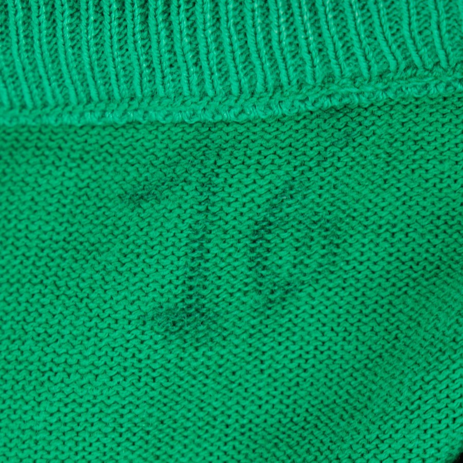 La maglia è completamente verde, con scollo tondo e polsini in maglina.