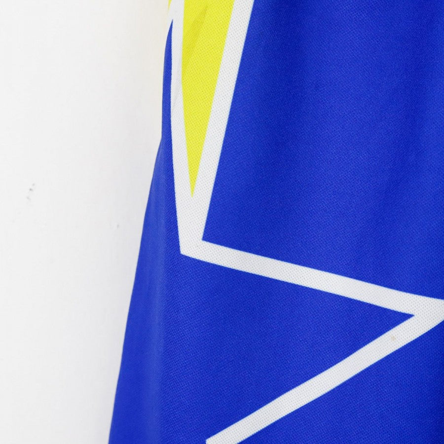 Pantaloncini away della Juventus stagione 1995/1996 realizzati da Kappa. Lo sponsor tecnico Kappa è visibile in ricamo sulla gamba, mentre il design è dominato da grandi stelle blu contornate di bianco su base gialla e blu. Presentano una linea ampia e classica, tipica dell'epoca, con elastico e laccetto in vita. Taglia L.