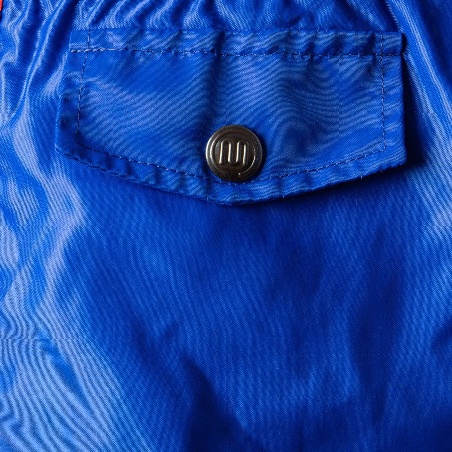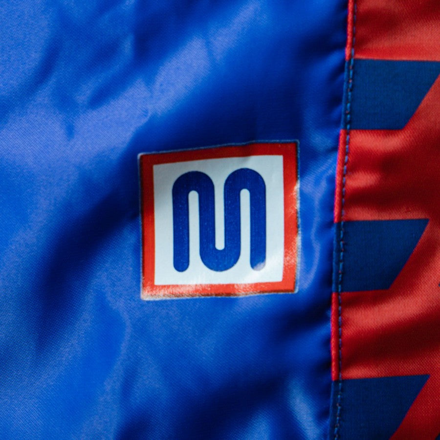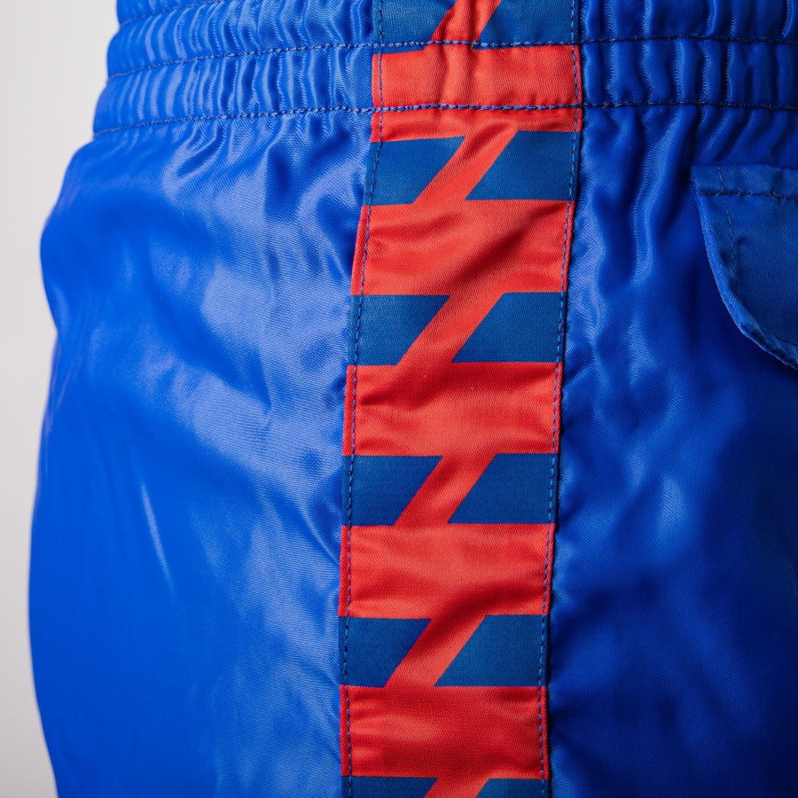 Modello di colore blu royal con bande laterali a fantasia blu e rosse. Il logo dello sponsor tecnico Meyba è applicato sulla gamba sinistra.