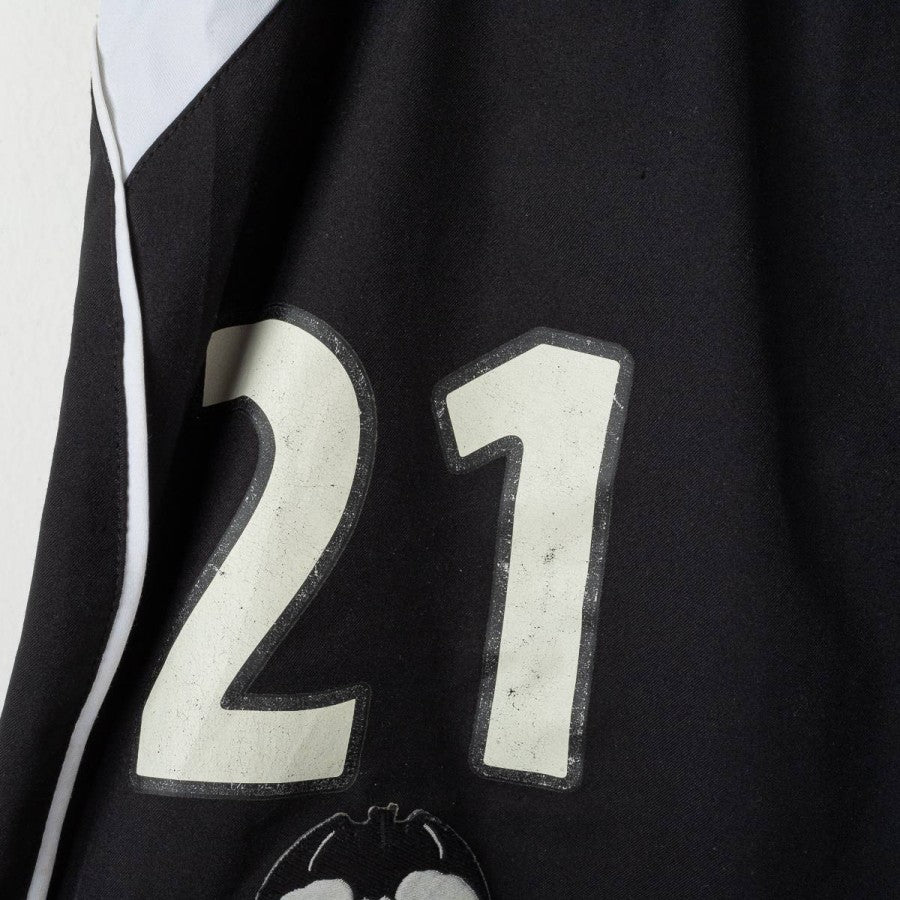 Pantaloncini Home del Valencia CF, stagione 2002/2003, prodotti da Nike. Modello da gara nero con inserti bianchi e profili in piping. Logo Nike ricamato sulla gamba sinistra e stemma del club cucito sulla destra. Numero 21 applicato in bianco con contorno nero in materiale flock. Girovita elasticizzato con cordino interno regolabile. Taglia L.