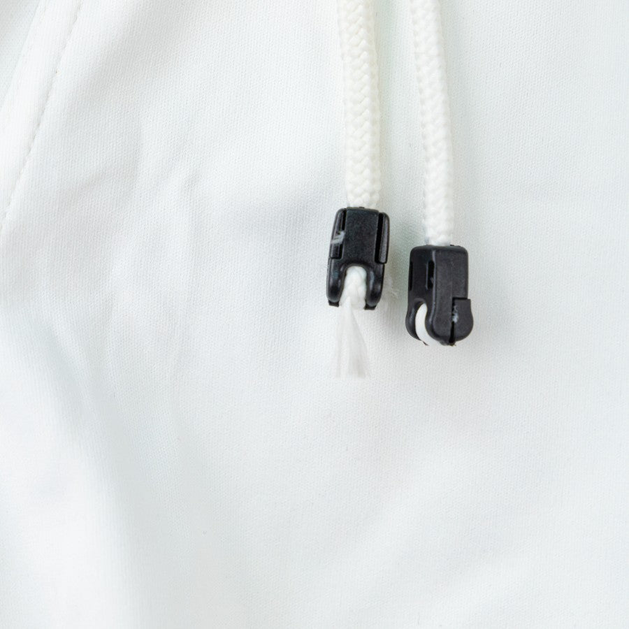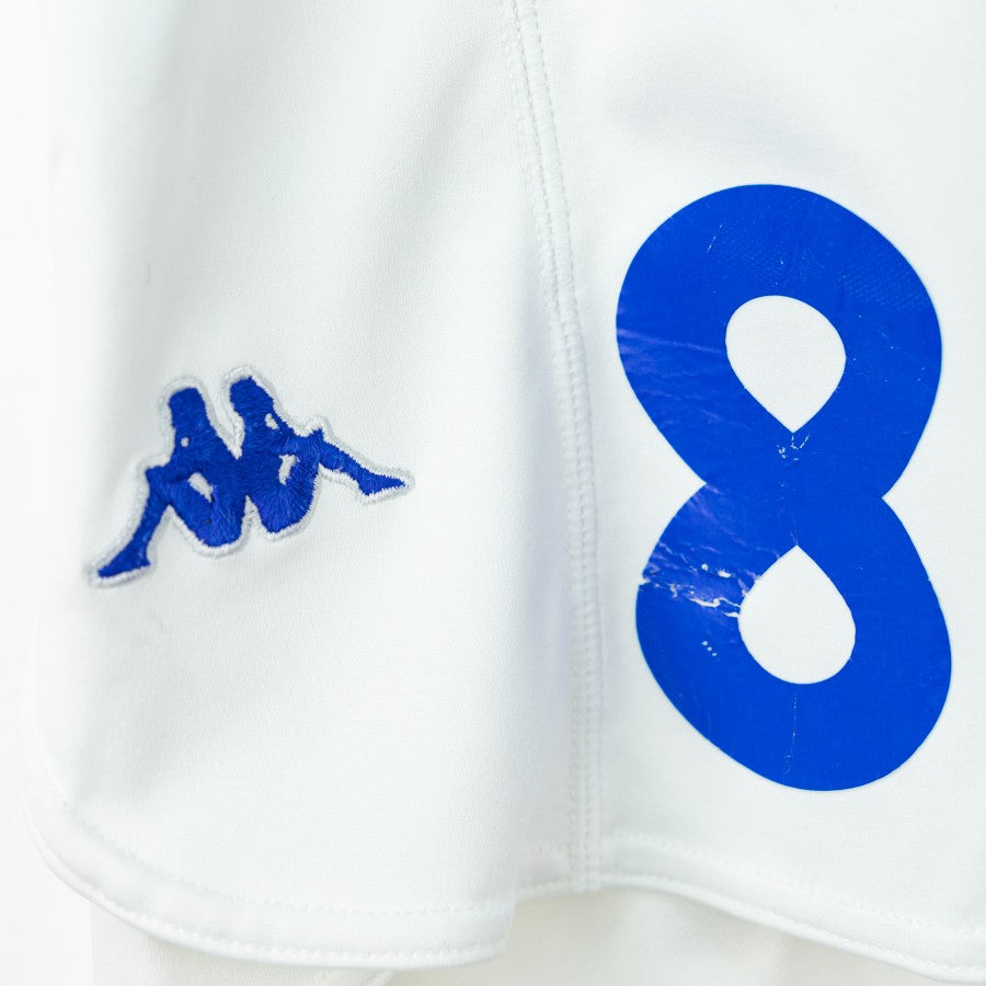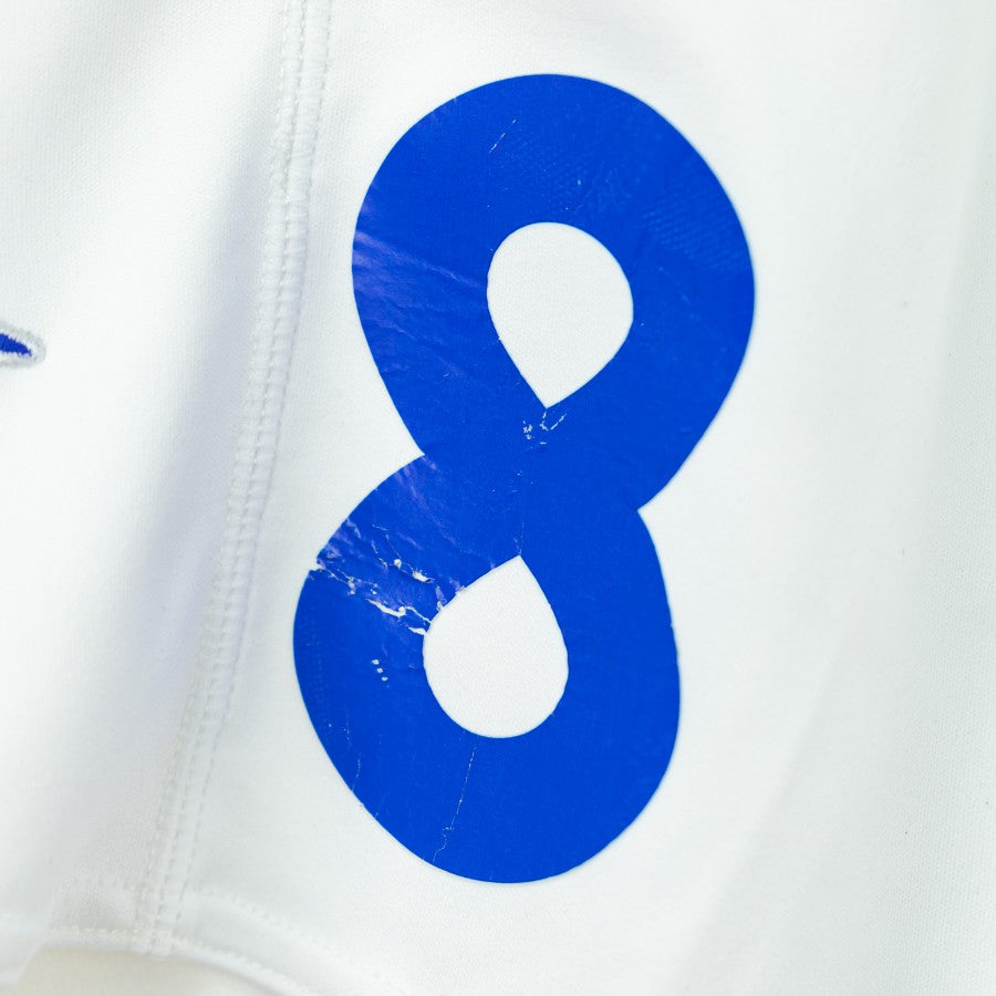 Modello di colore bianco con inserti in blu. Sulla destra applicato il numero 8. Logo dello sponsor tecnico applicato in entrambi i lati.