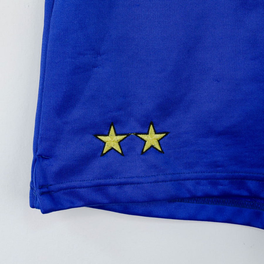 Modello di colore blu che completa il kit away della squadra, con stelline cucite sulla gamba destra.