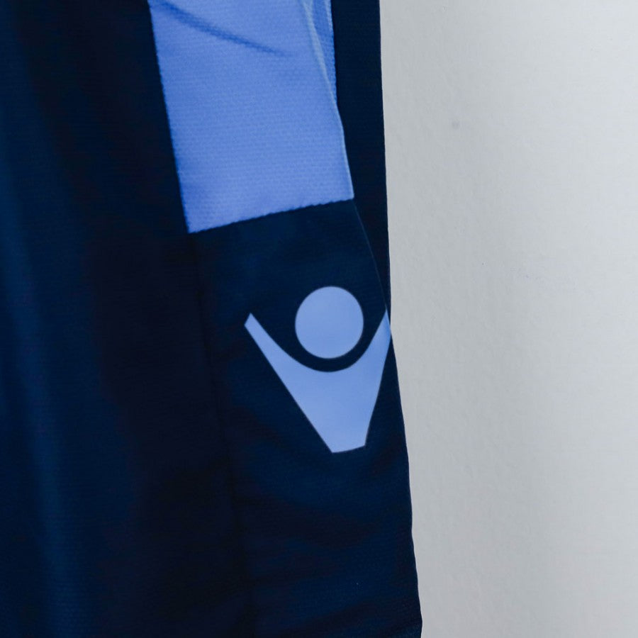 Modello blu con dettagli azzurri, con lo stemma del club sulla gamba destra.