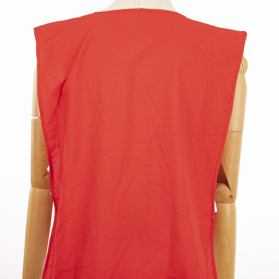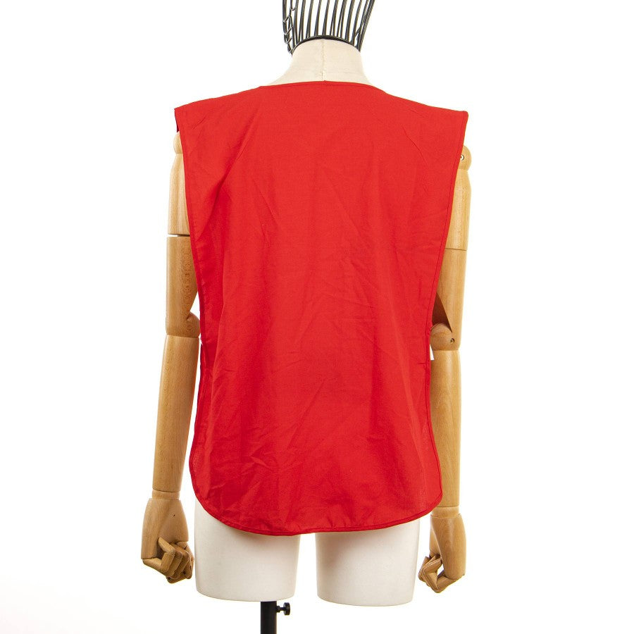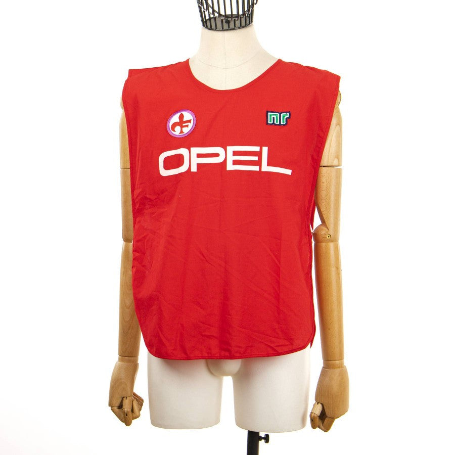 Modello pettorina a giro manica di colore rosso acceso utilizzata nei moneti di allenamento e riscaldamento. La casacca si presenta in tessuto leggero con un giro collo ampio. Sul fronte a destra è ricamato lo stemma societario della Fiorentina, a sinistra cucito il logo dello sponsor tecnico Ennerre, al centro applicato lo sponso commelciale Opel.