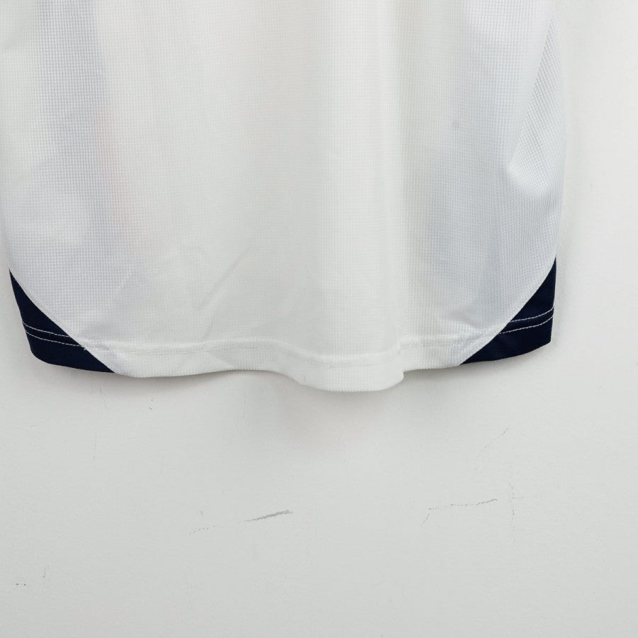 Polo ufficiale della nazionale inglese utilizzata nella stagione 2004, realizzata dallo sponsor tecnico Umbro. Il modello presenta un design classico con base bianca, inserti blu scuro sui fianchi e dettagli rossi su spalle e bordi. Sul petto si trovano il logo Umbro ricamato in blu e lo stemma dei Tre Leoni con stella dorata, simbolo del trionfo mondiale del 1966. La scritta “England” è stampata verticalmente sul fianco sinistro. Il colletto è a polo con zip corta. La taglia è M, come indicato sull'etichetta interna.